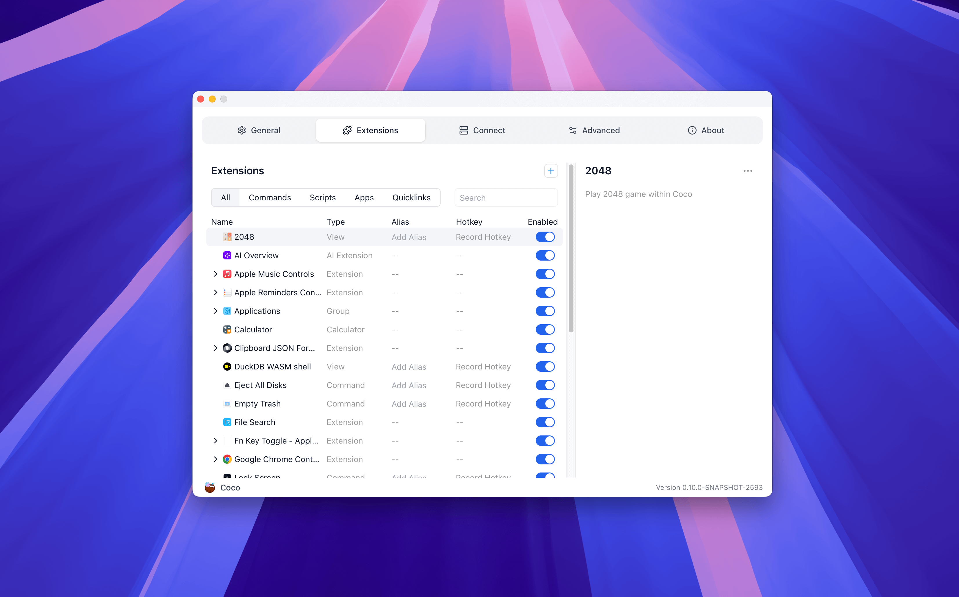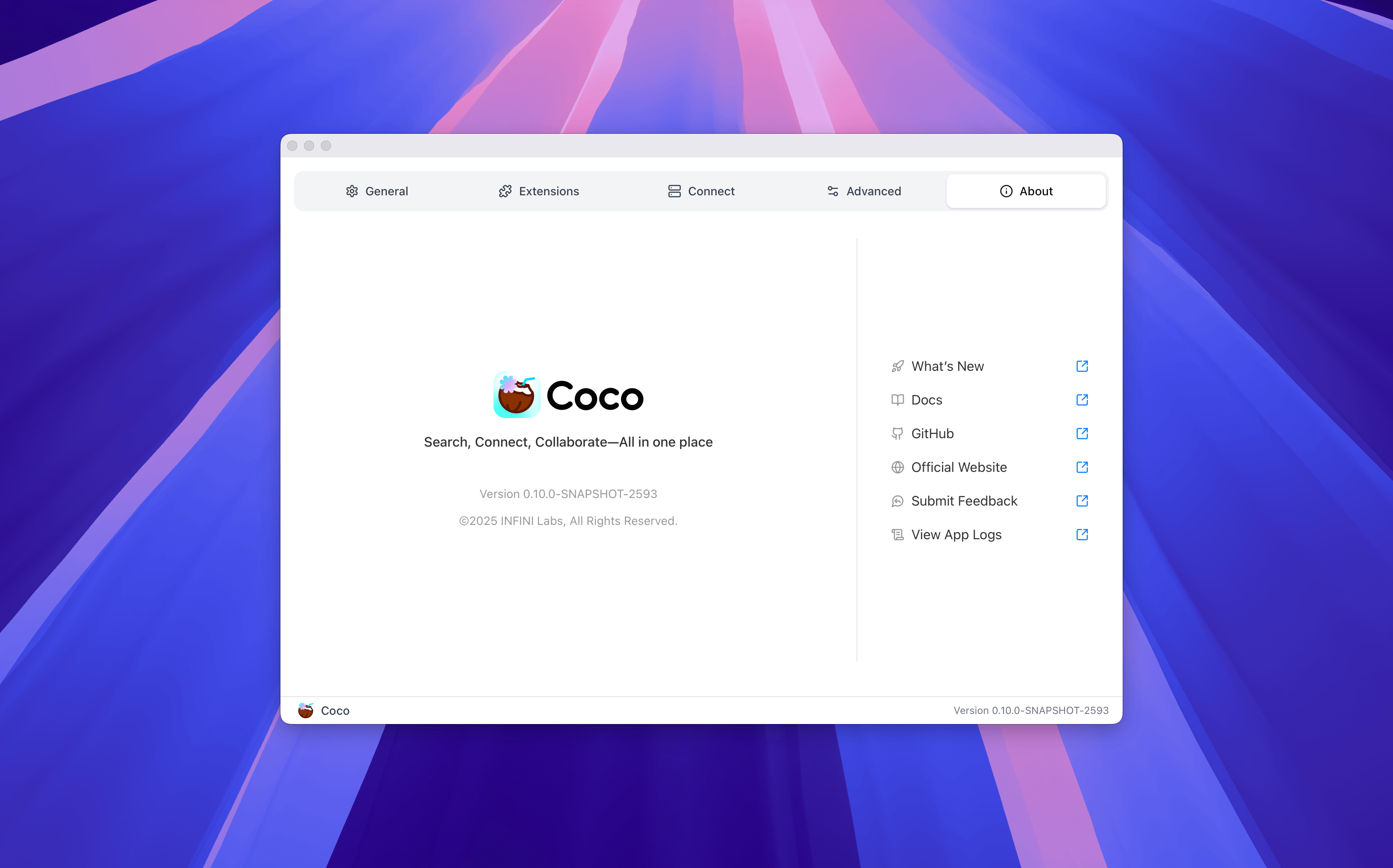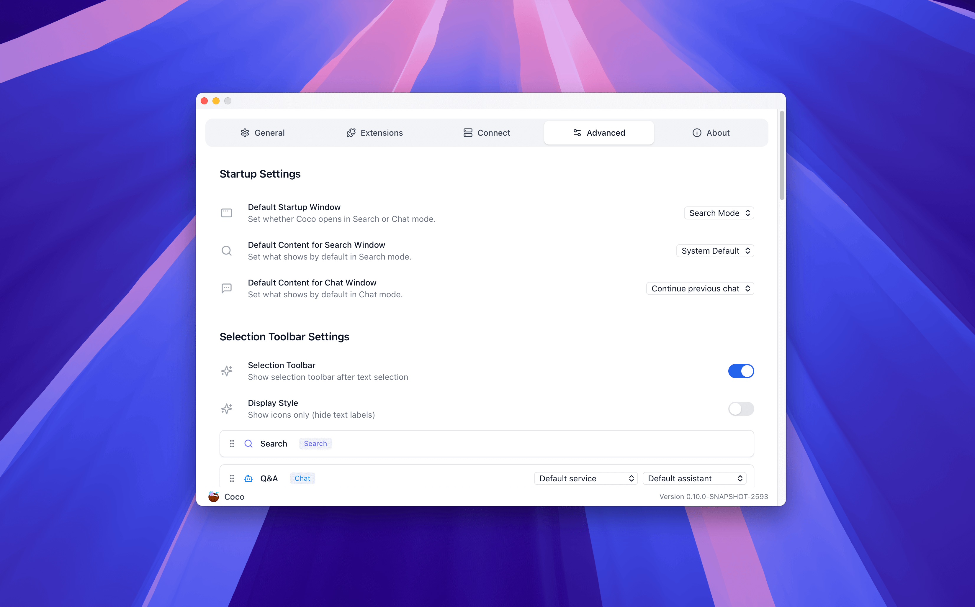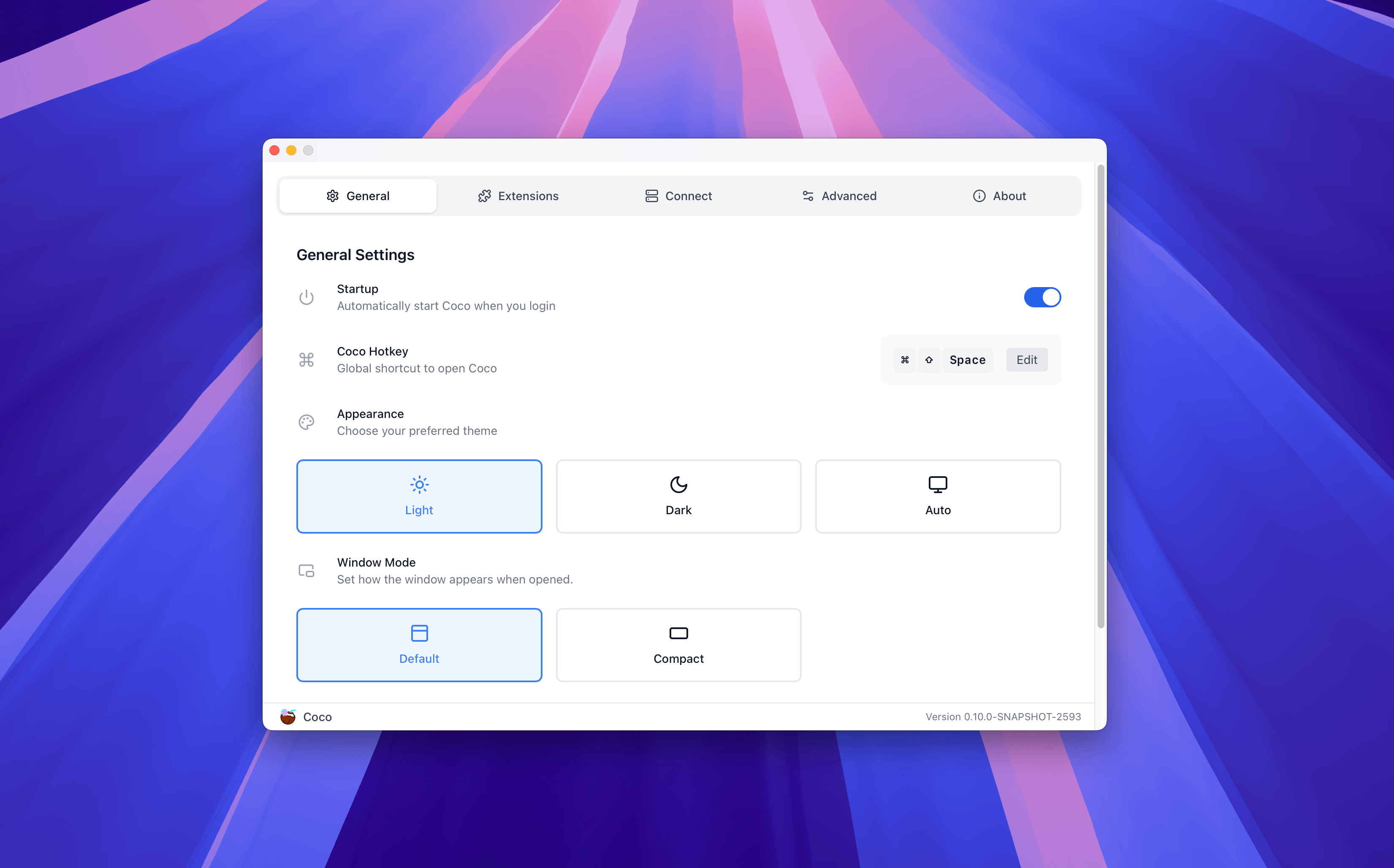 In Coco AI, you can adjust various settings of the application according to your personal needs (shortcut: Meta + ,) . The settings page is divided into several main sections, allowing you to easily manage startup items, shortcuts, extensions, connections, and advanced features.