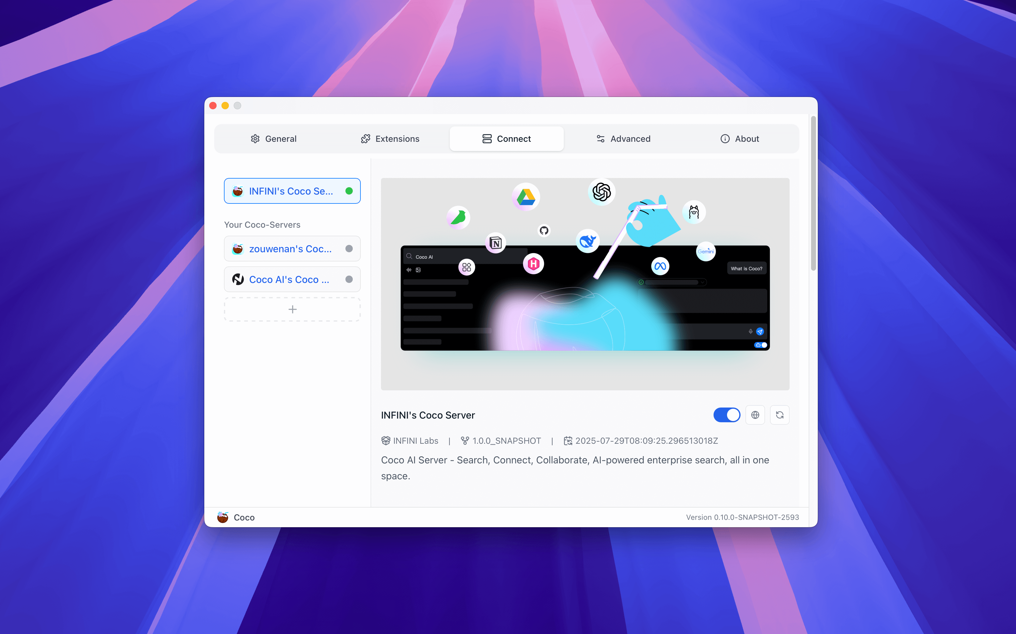 In the Connect Settings, you can view and manage connections to Coco Server. This section involves logging in, enabling/disabling, and deleting connected servers.