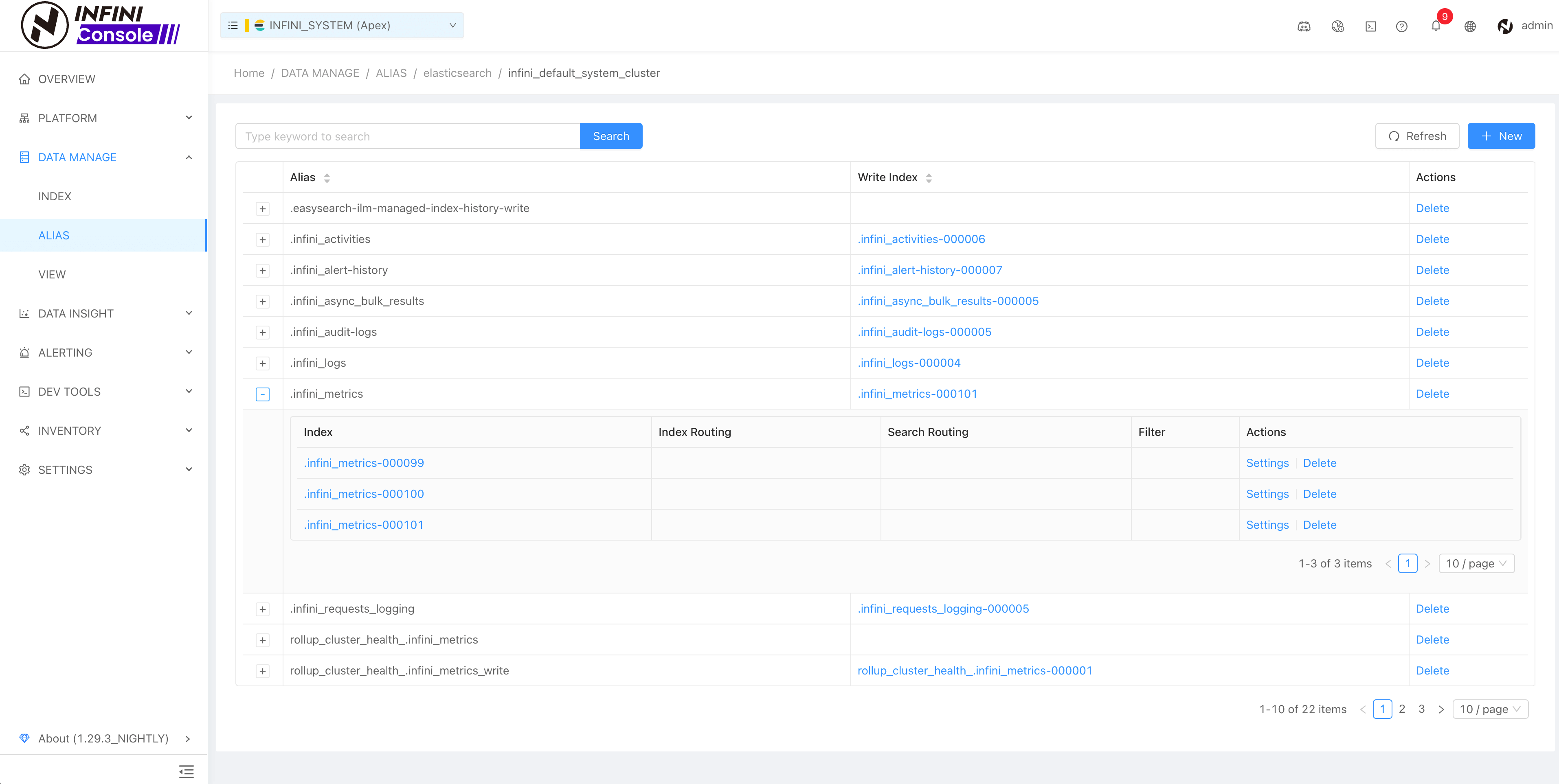 Clicking the + button at the beginning of the alias list row will expand and display the index list bound to the alias, and at the same time, you can set and delete the relational binding update of the index.