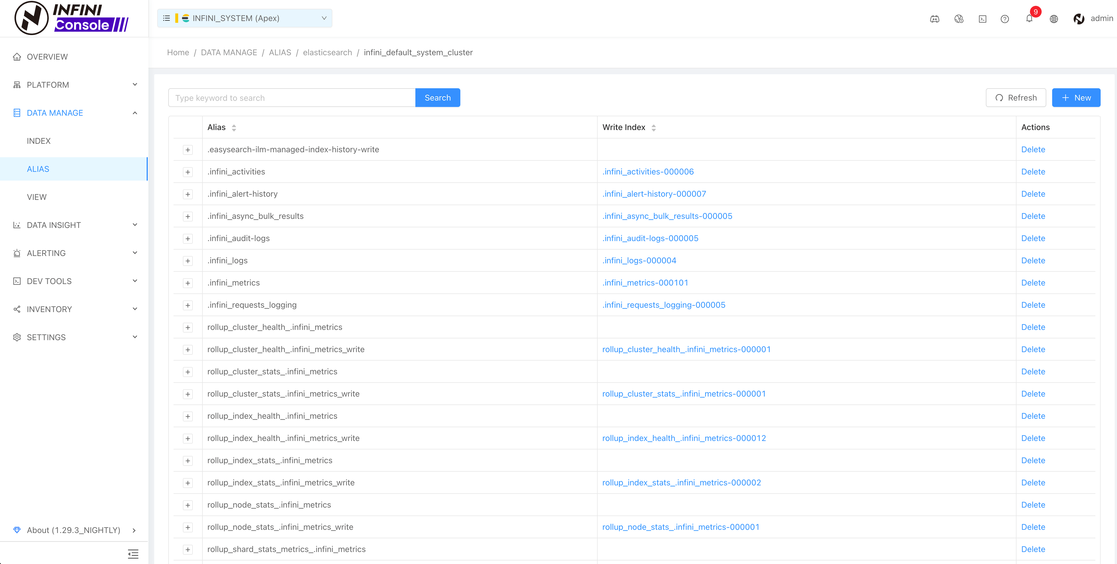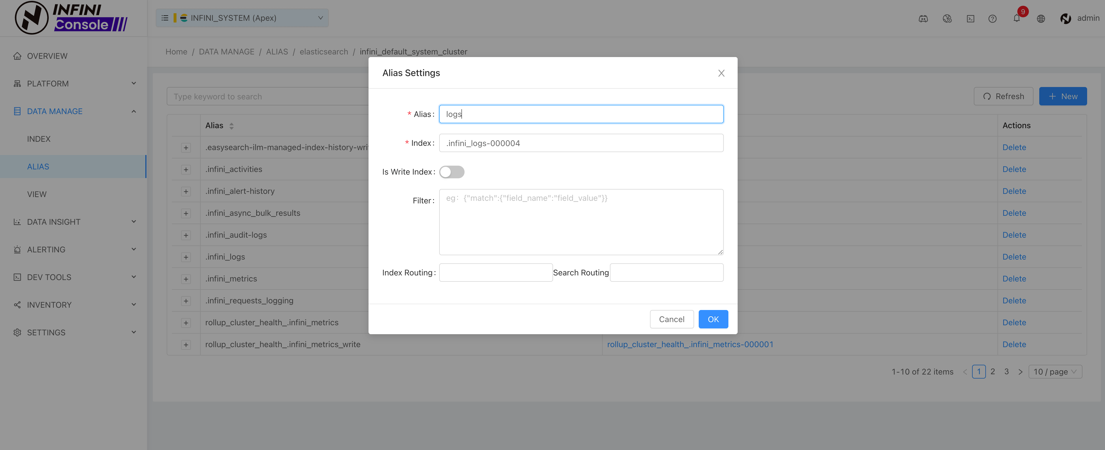 - Index: Select the target index corresponding to the alias, and use (*) to bind multiple indexes.