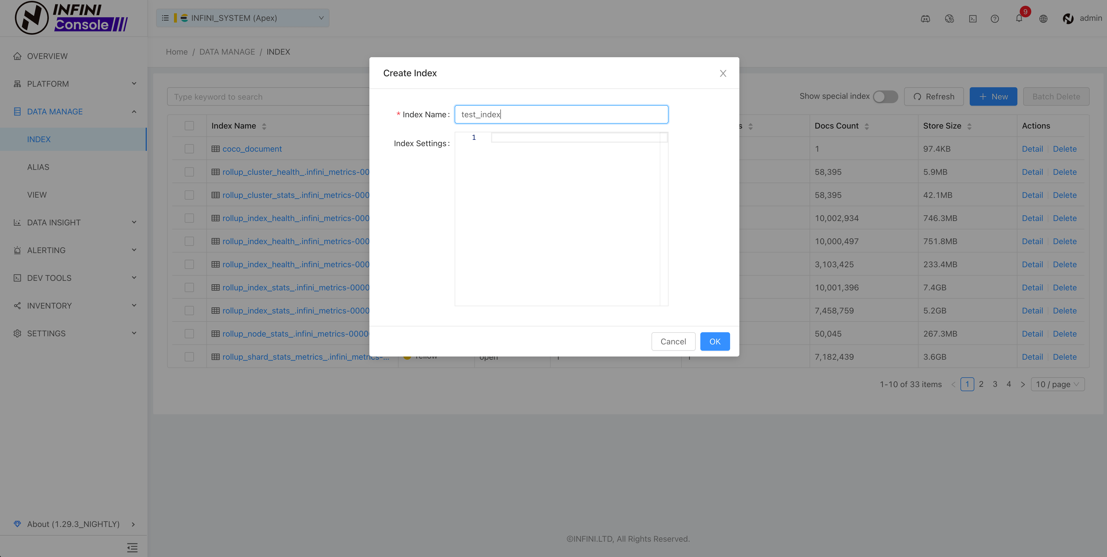 Input the new index name and index settings to complete the addition.