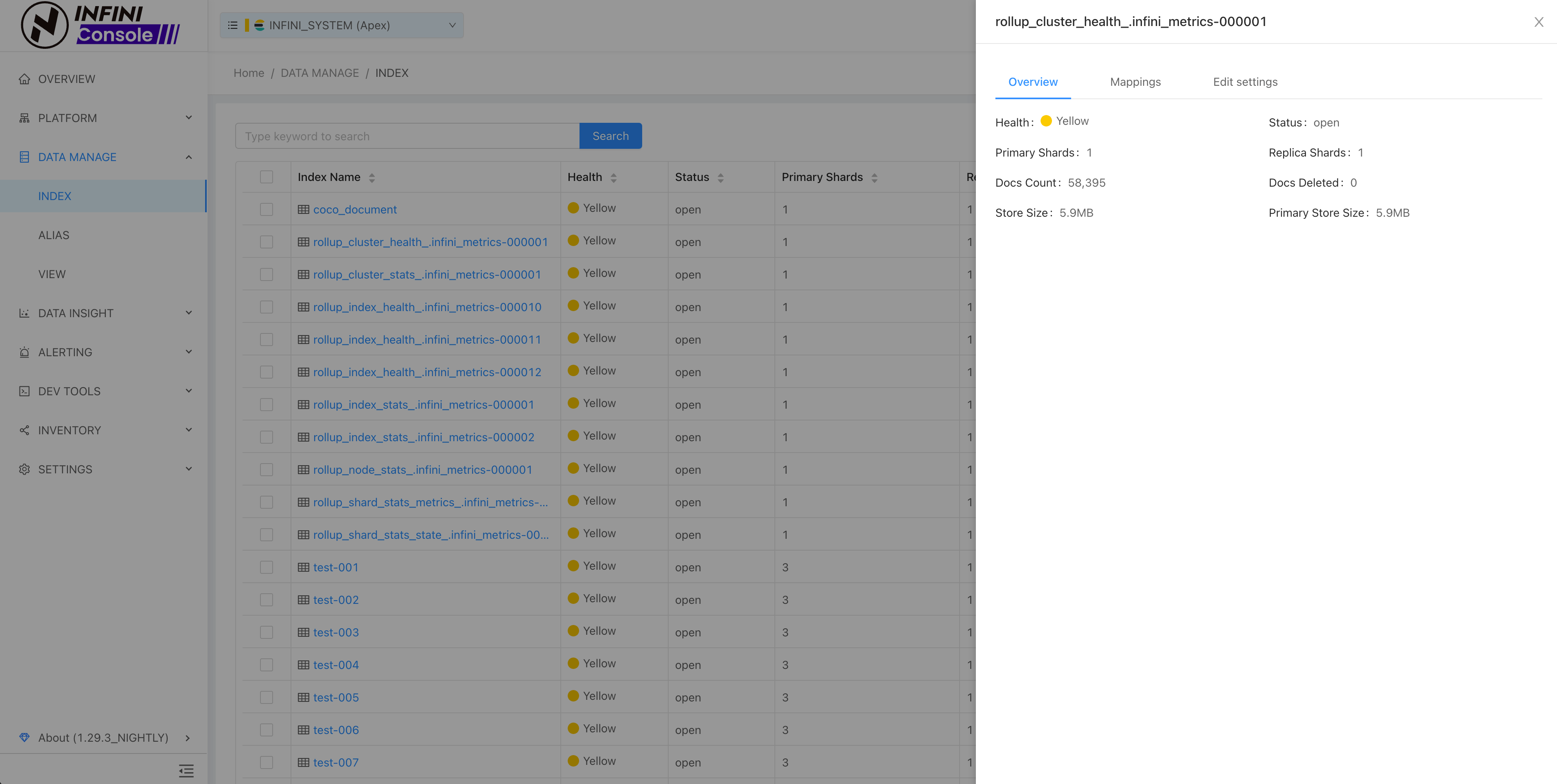 You can view the index health status, number of shards, number of documents, storage size and other details, as well as view and modify Mappings and Edit settings.