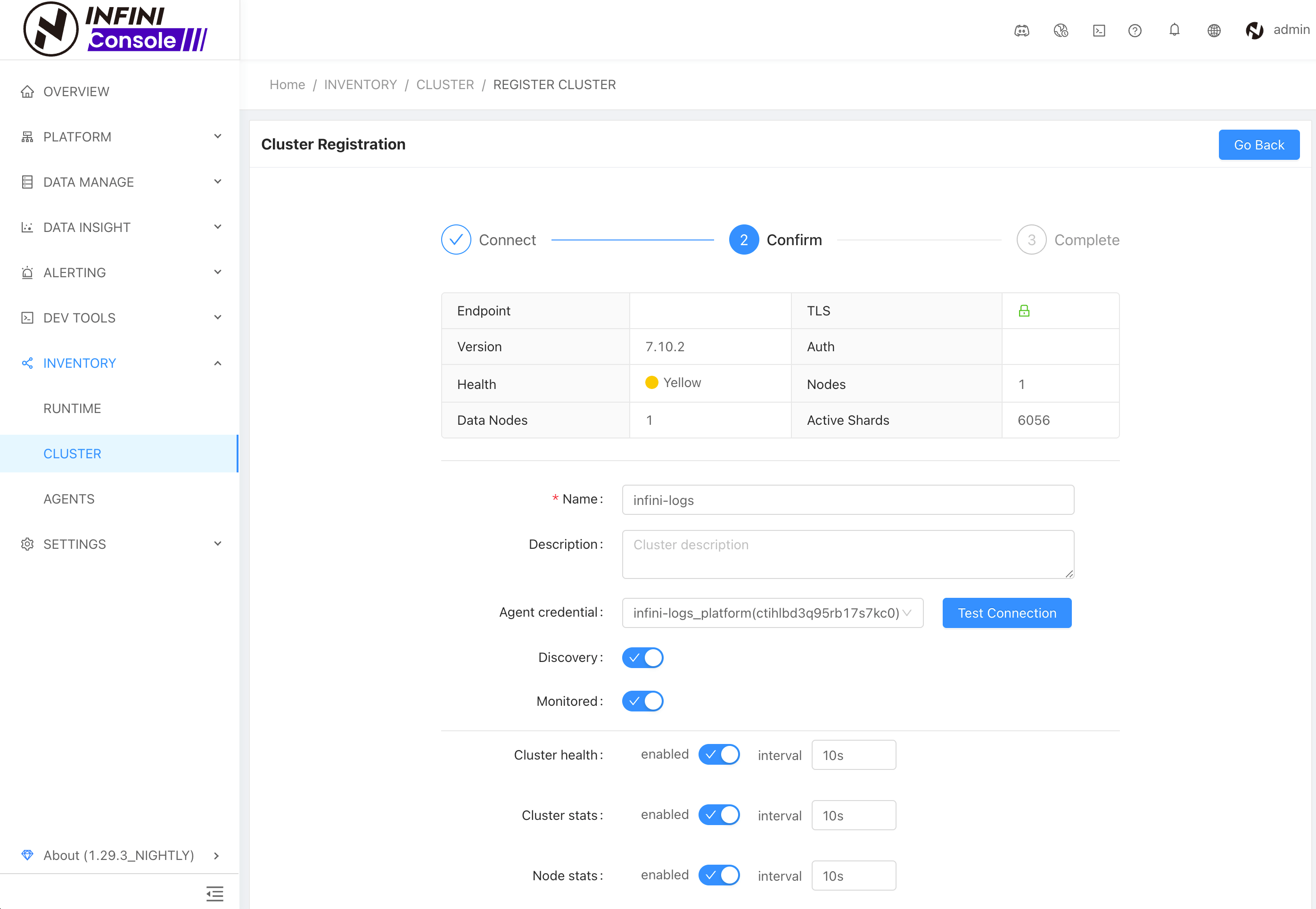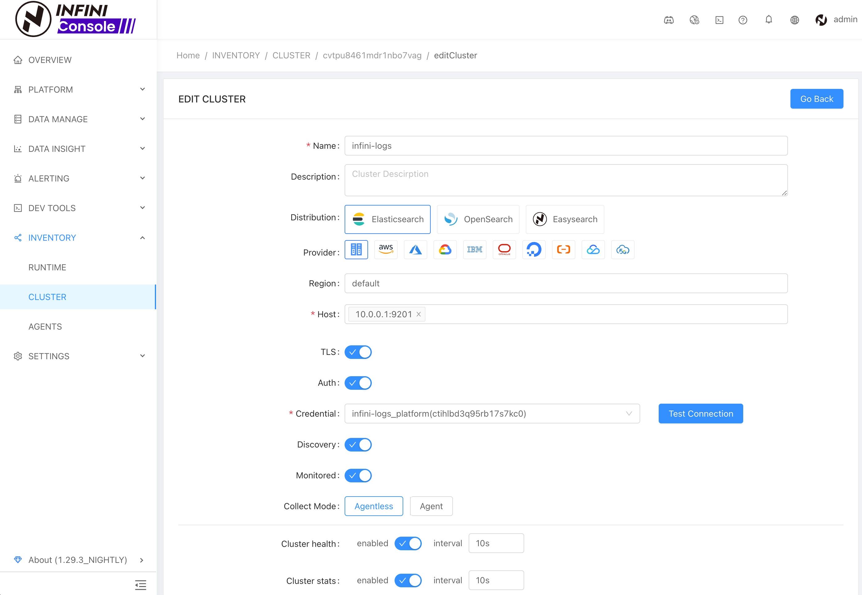 The registered Elasticsearch cluster can be queried in the cluster list