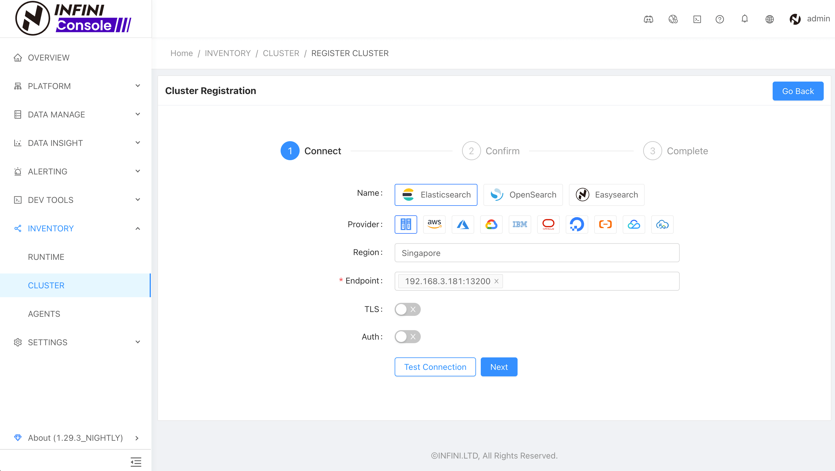 The first step is to fill in the cluster address, and enable TLS and authentication as needed (you need to input a user name and password after enabling authentication).