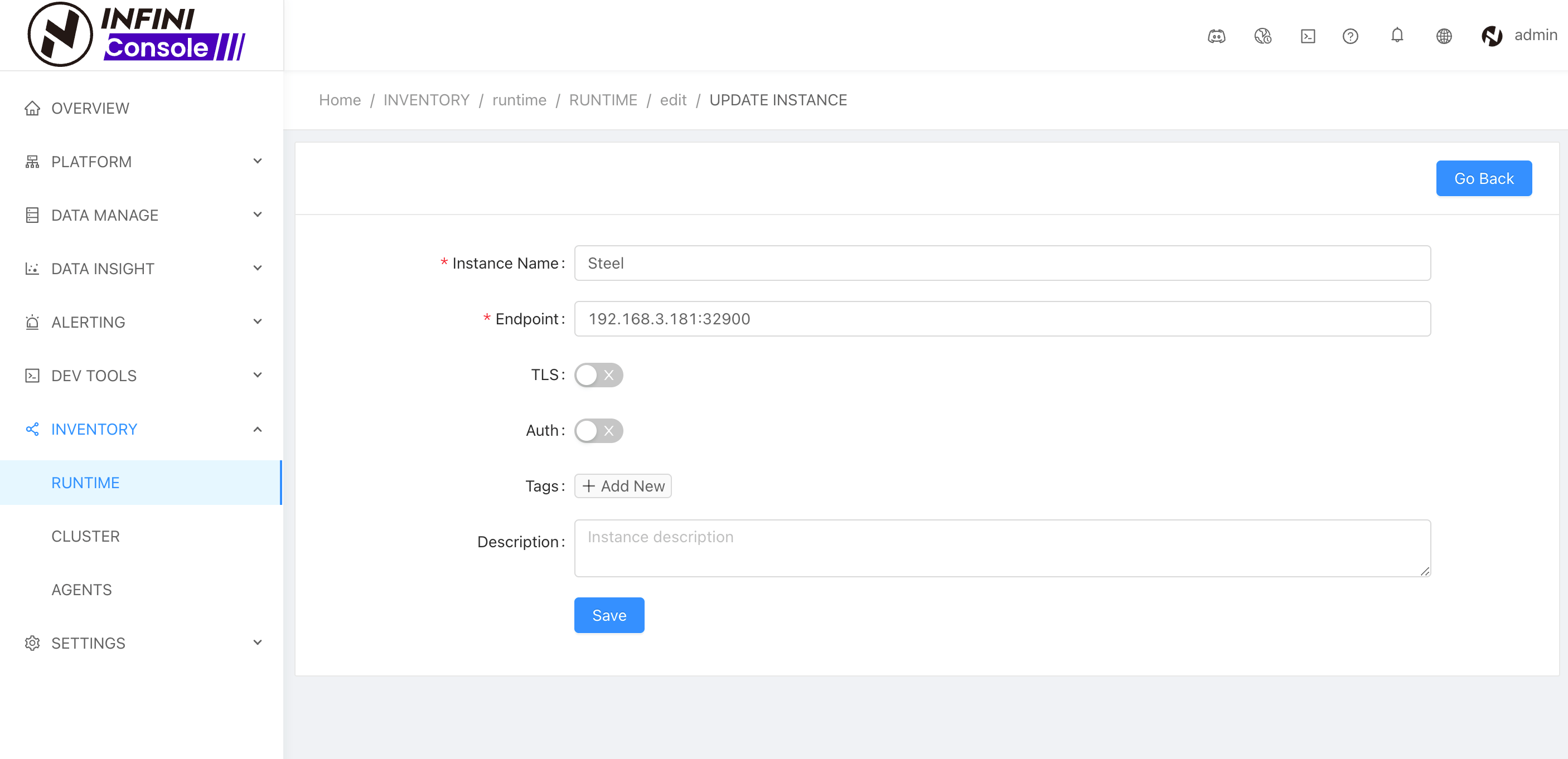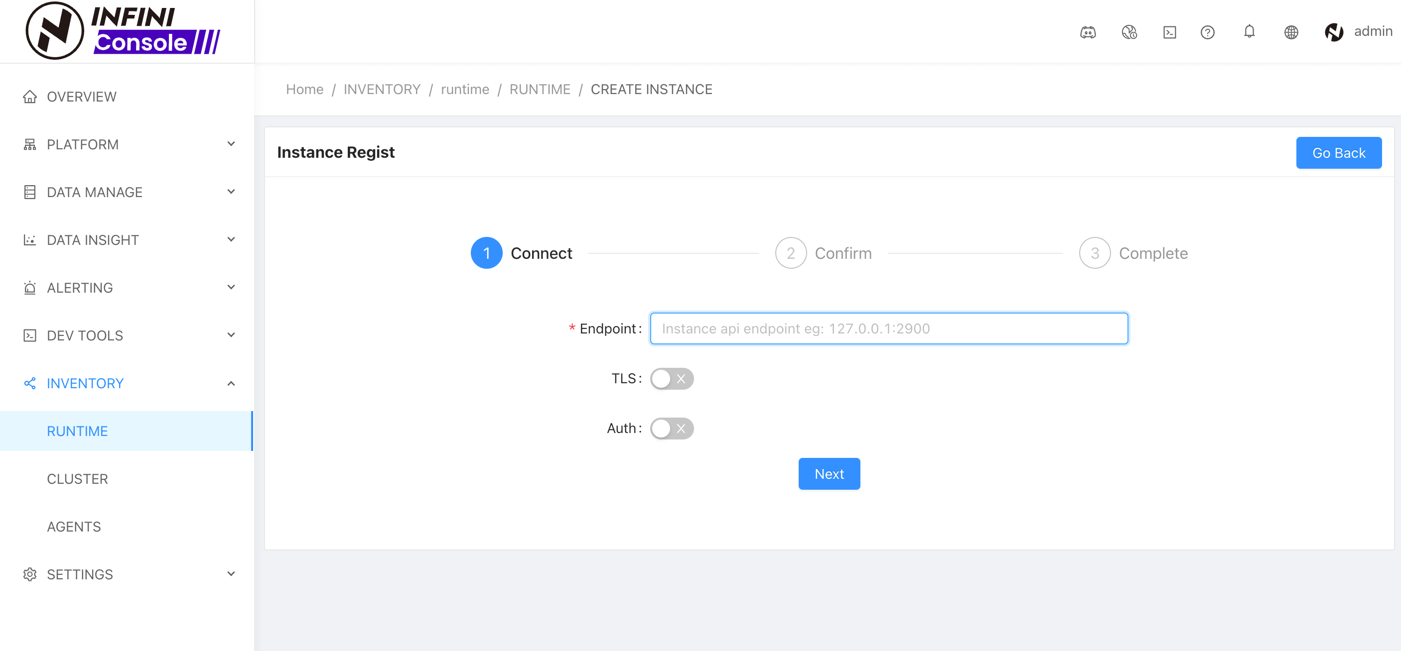 Step 1: Enter the instance address, and optionally enable TLS and authentication (if authentication is enabled, a username and password are required).