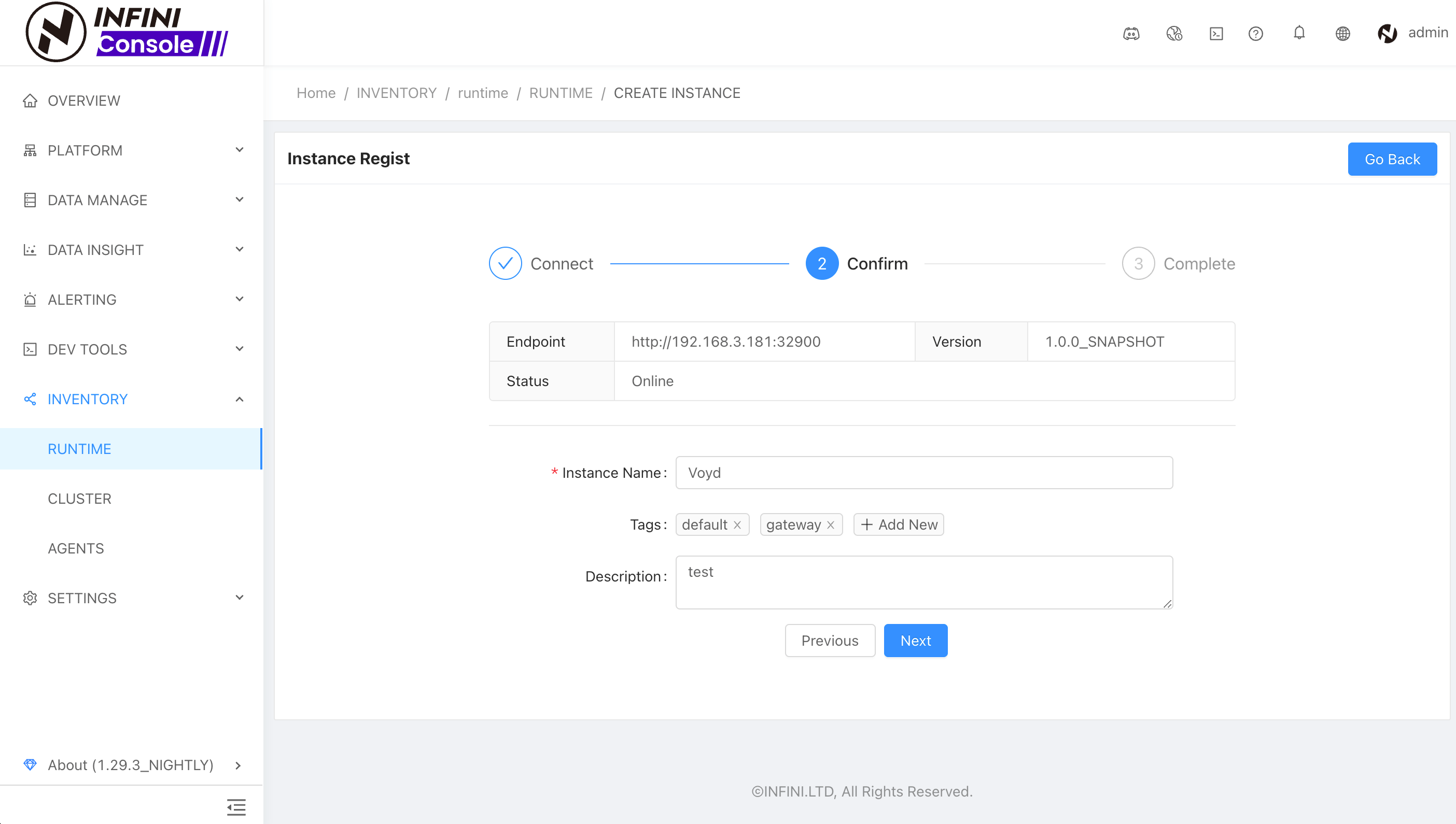 Step 2: Confirm the information, and optionally modify the instance name, tags, and description.