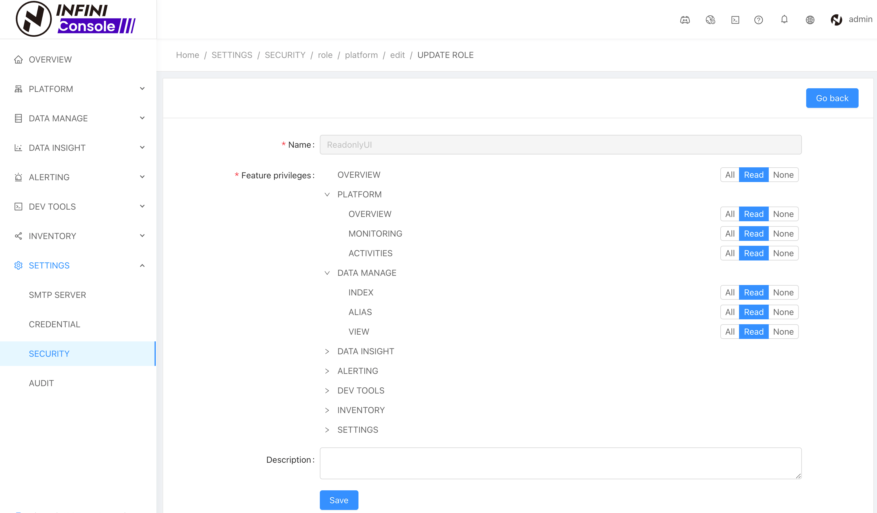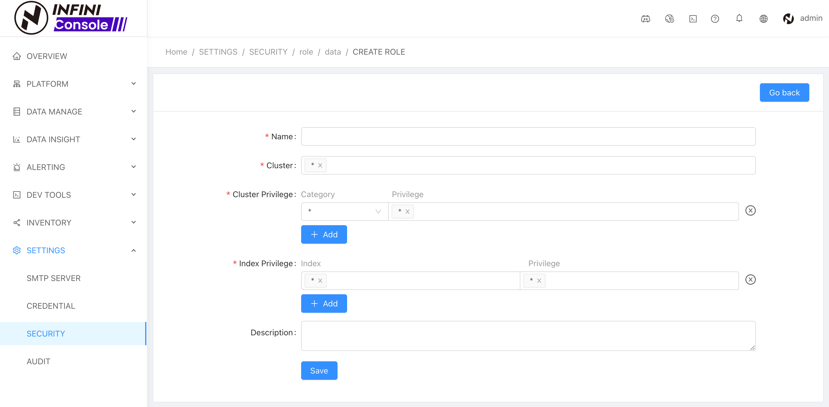 Role Management includes CURD operations for role. And INFINI Console has a builtin role named