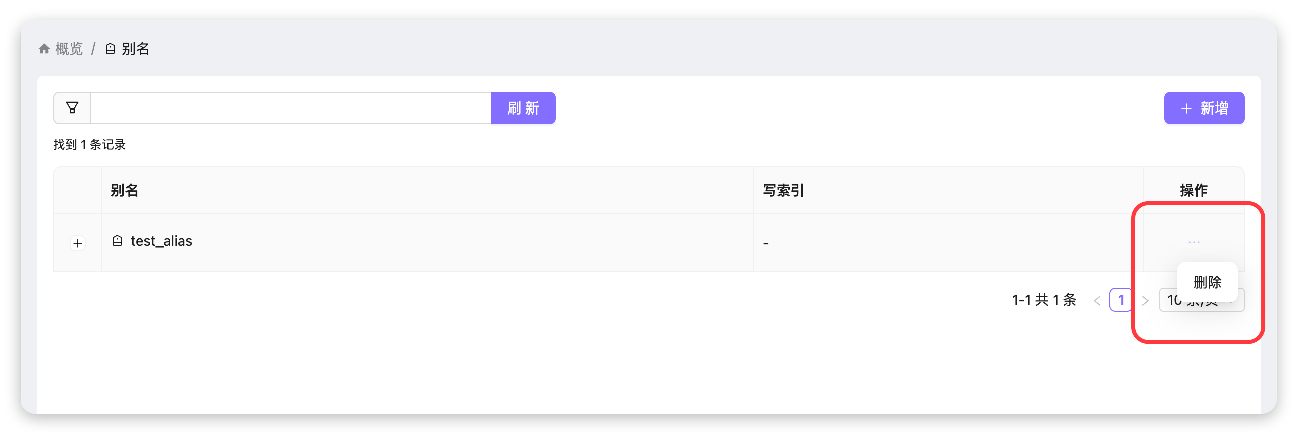 test_alias),点击该行「操作」列的更多按钮(...),在弹出菜单中选择「删除」。