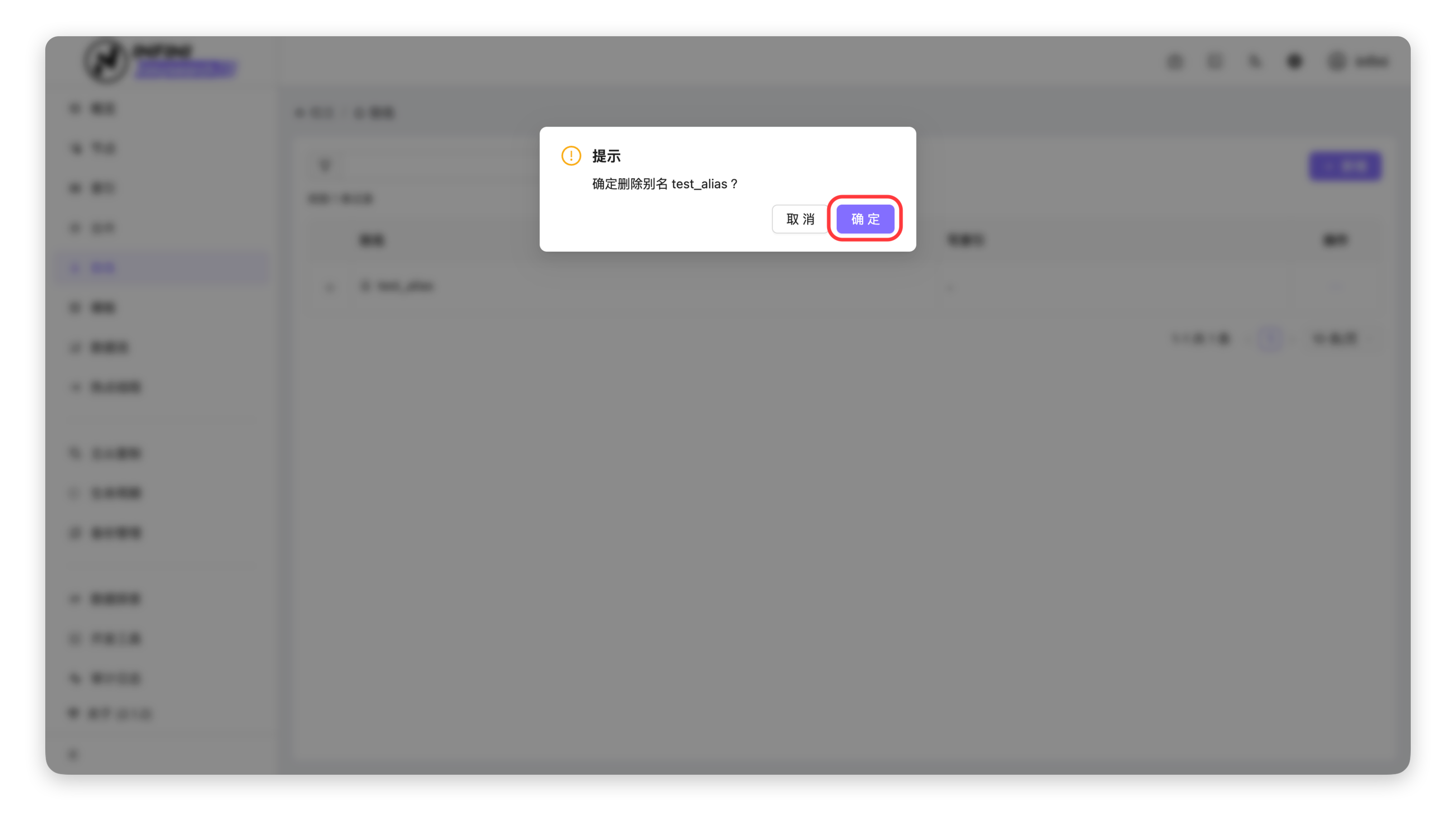 - 确认删除操作:在弹出的确认提示框中,点击「确定」,系统将执行别名删除。