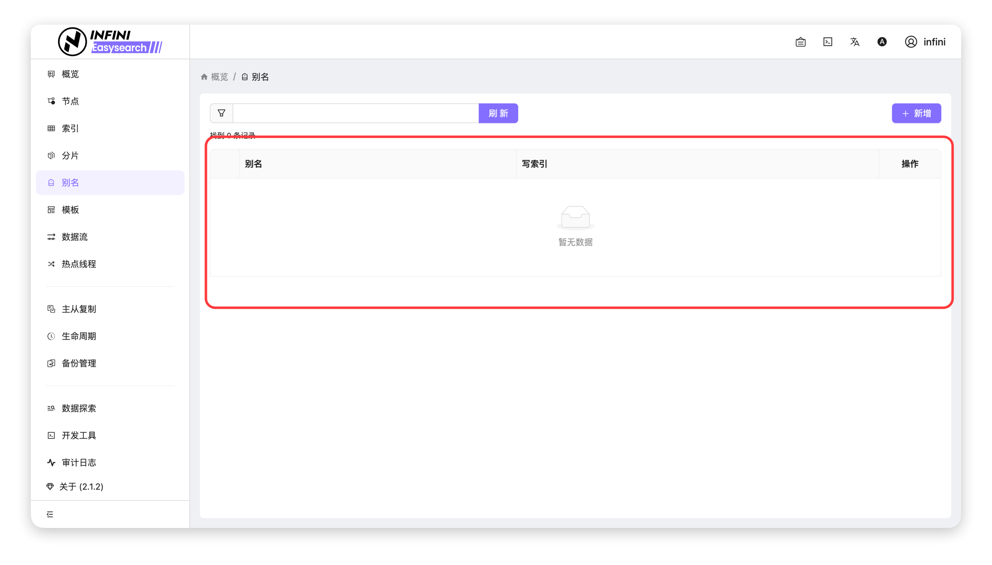进入别名管理页:在左侧导航栏点击「别名」,进入别名列表页面。