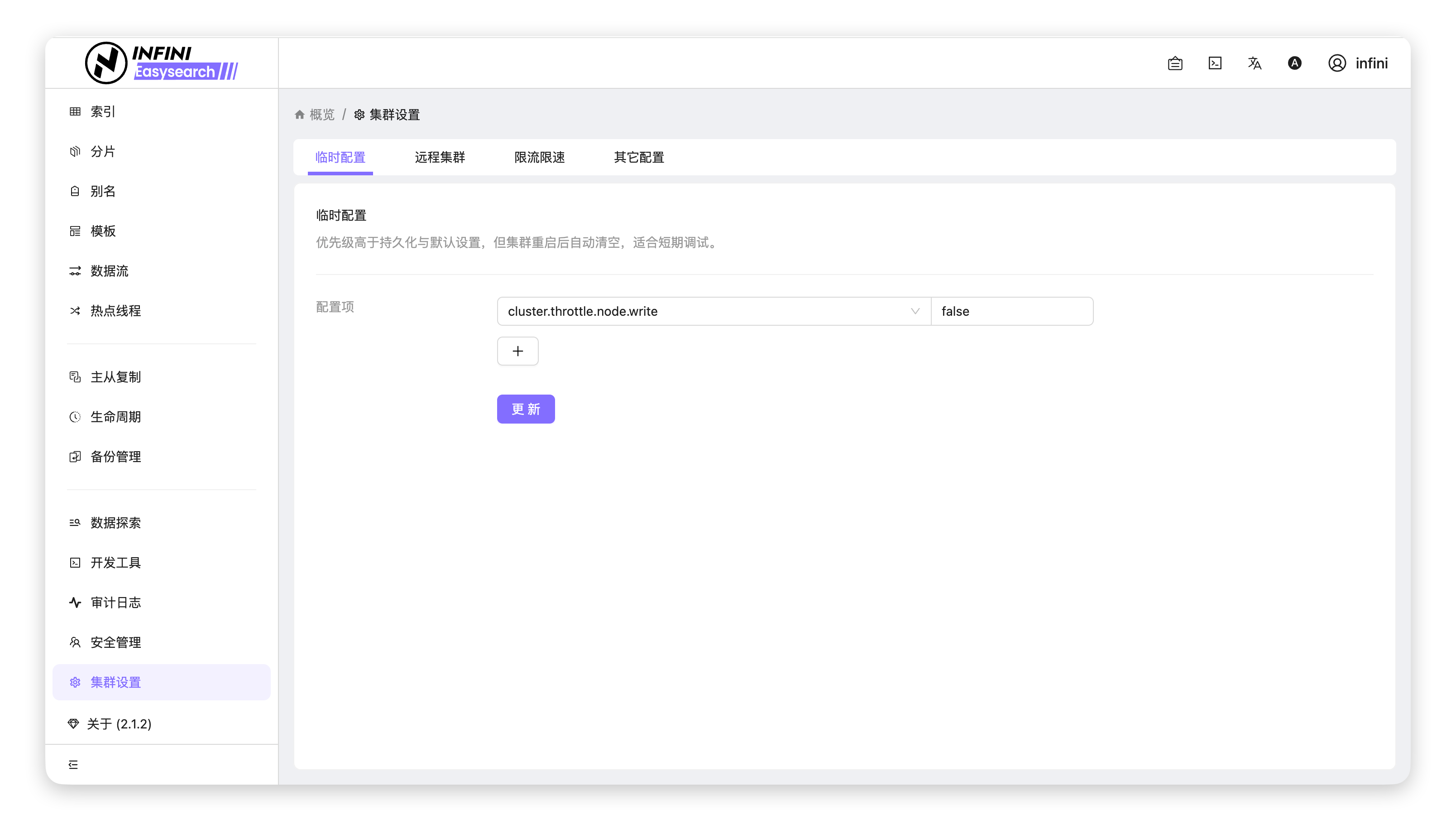 进入集群临时设置页面:在左侧导航栏点击「集群设置」,默认进入「临时配置」标签页。