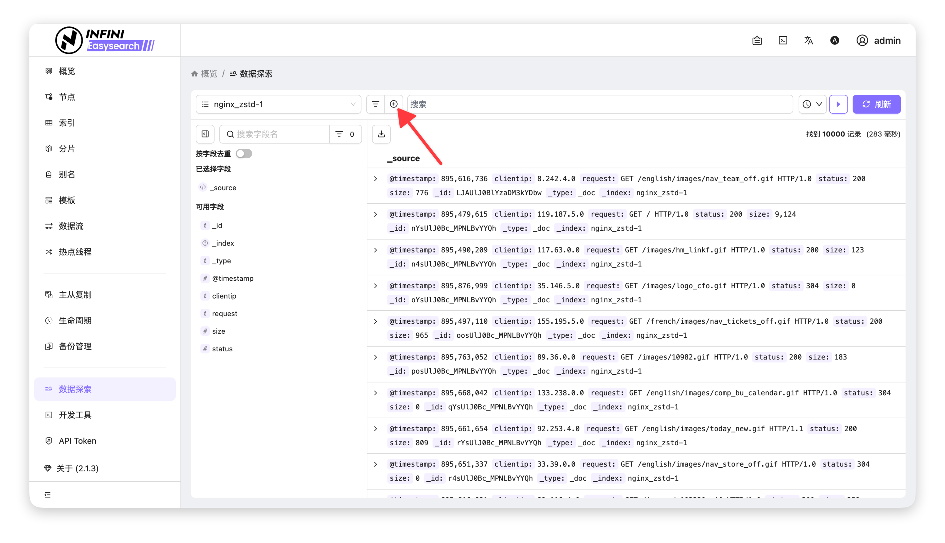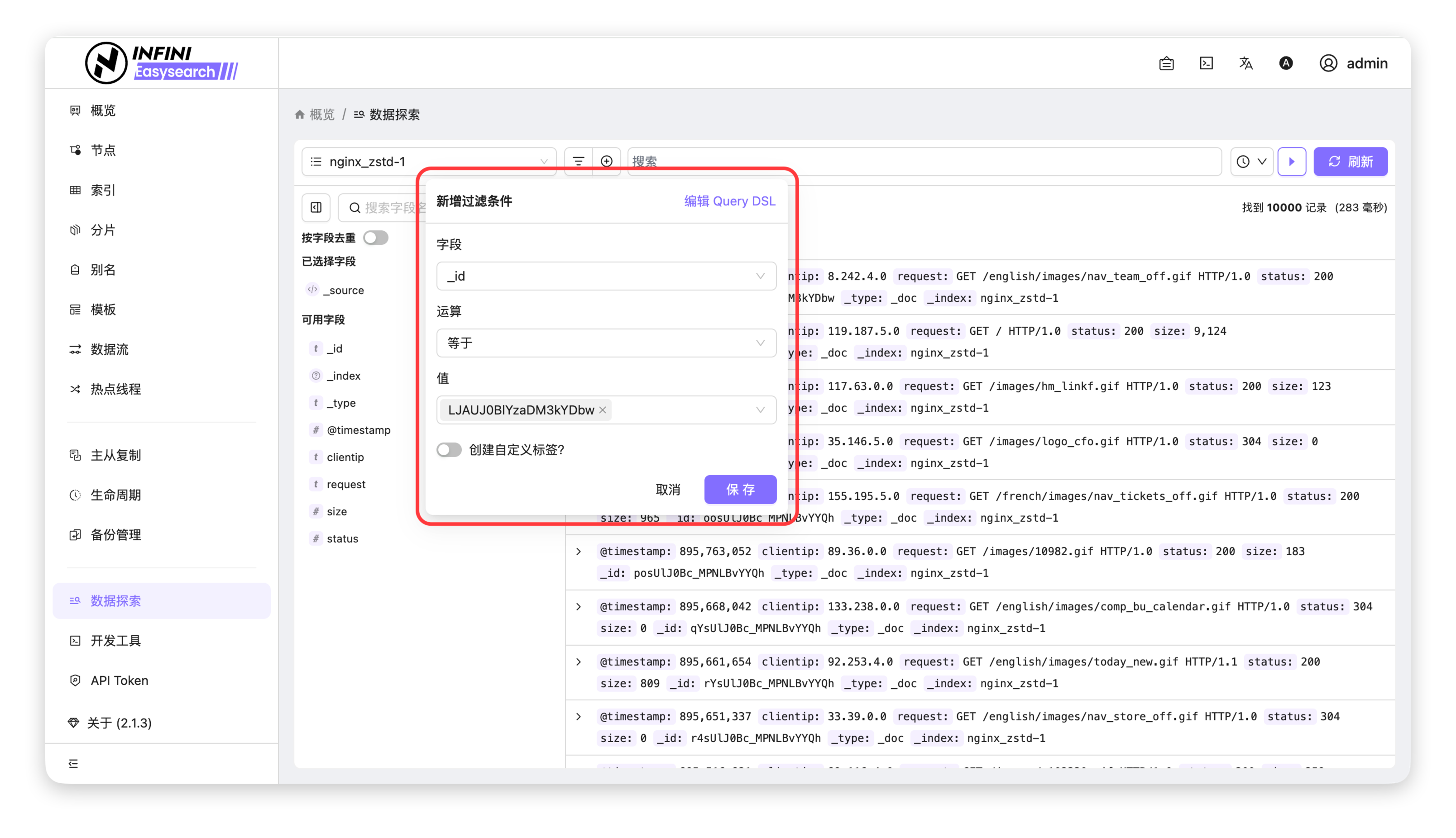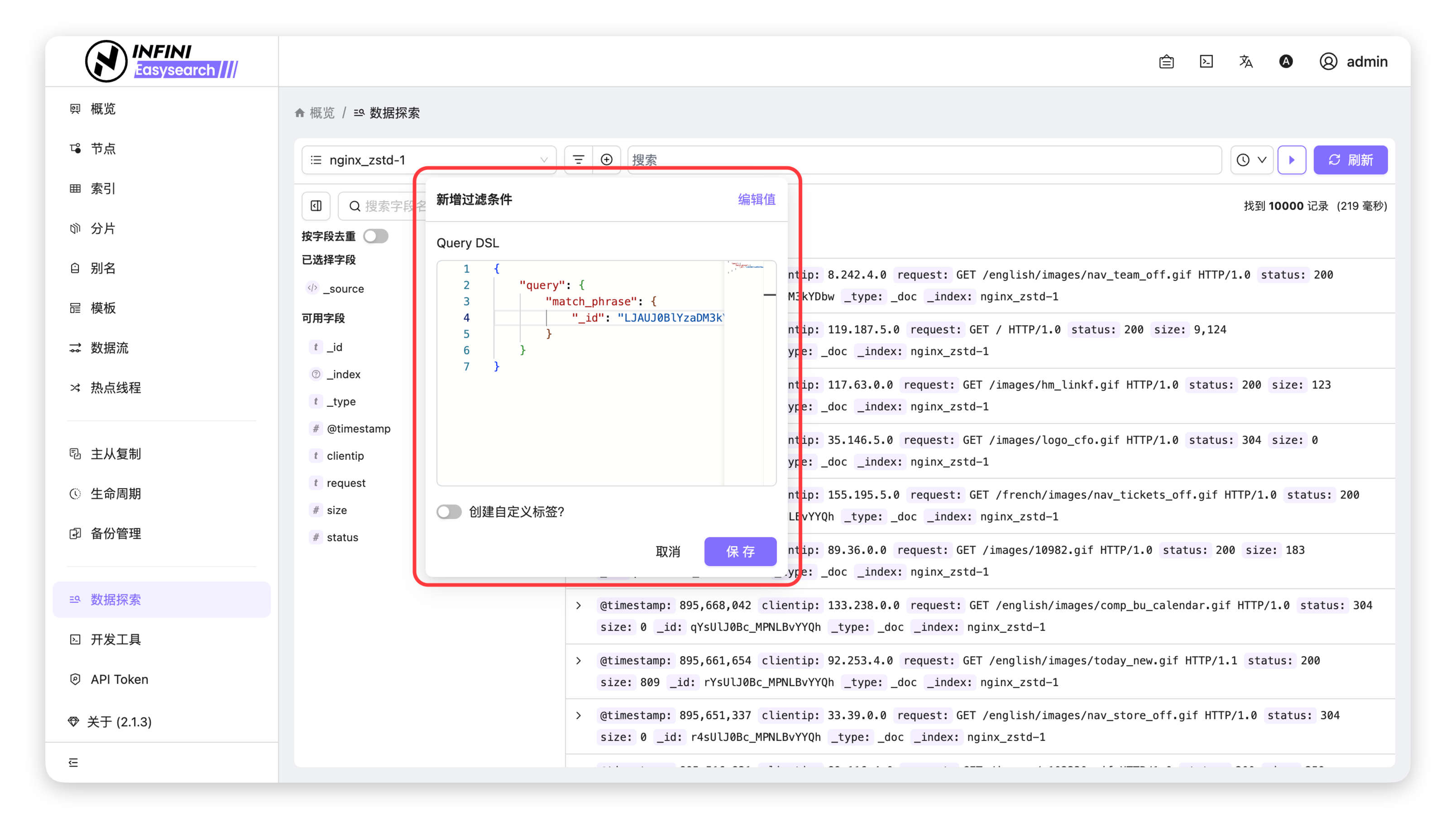 - (可选)使用 Query DSL 自定义过滤:点击窗口右上角的「编辑 Query DSL」,可切换至代码编辑模式,直接编写 Elasticsearch 查询 DSL 语句,实现复杂过滤逻辑。
