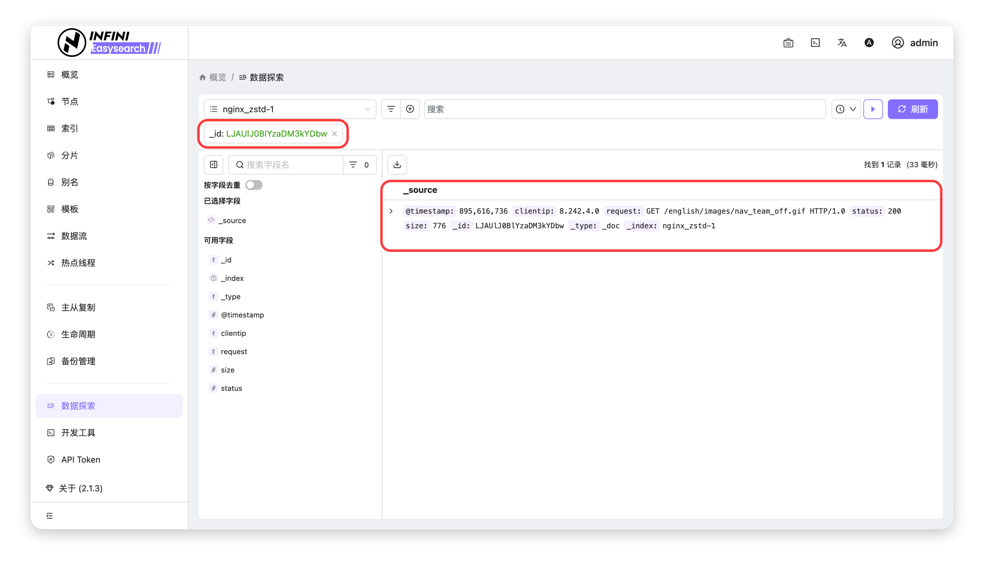 - 查看过滤结果:过滤条件生效后,将在搜索栏下方展示已生效的过滤标签,右侧数据列表将仅显示符合条件的文档记录。