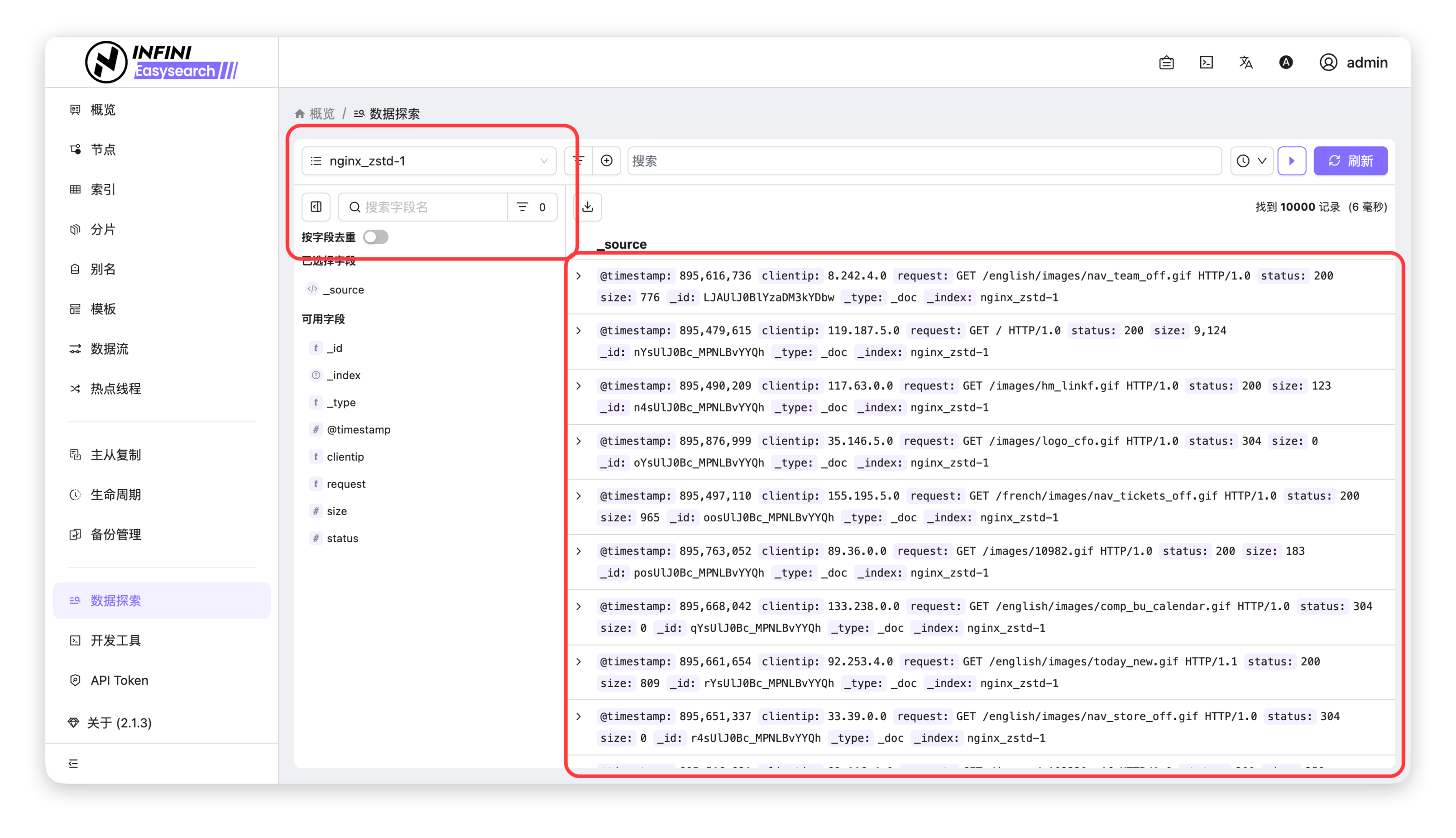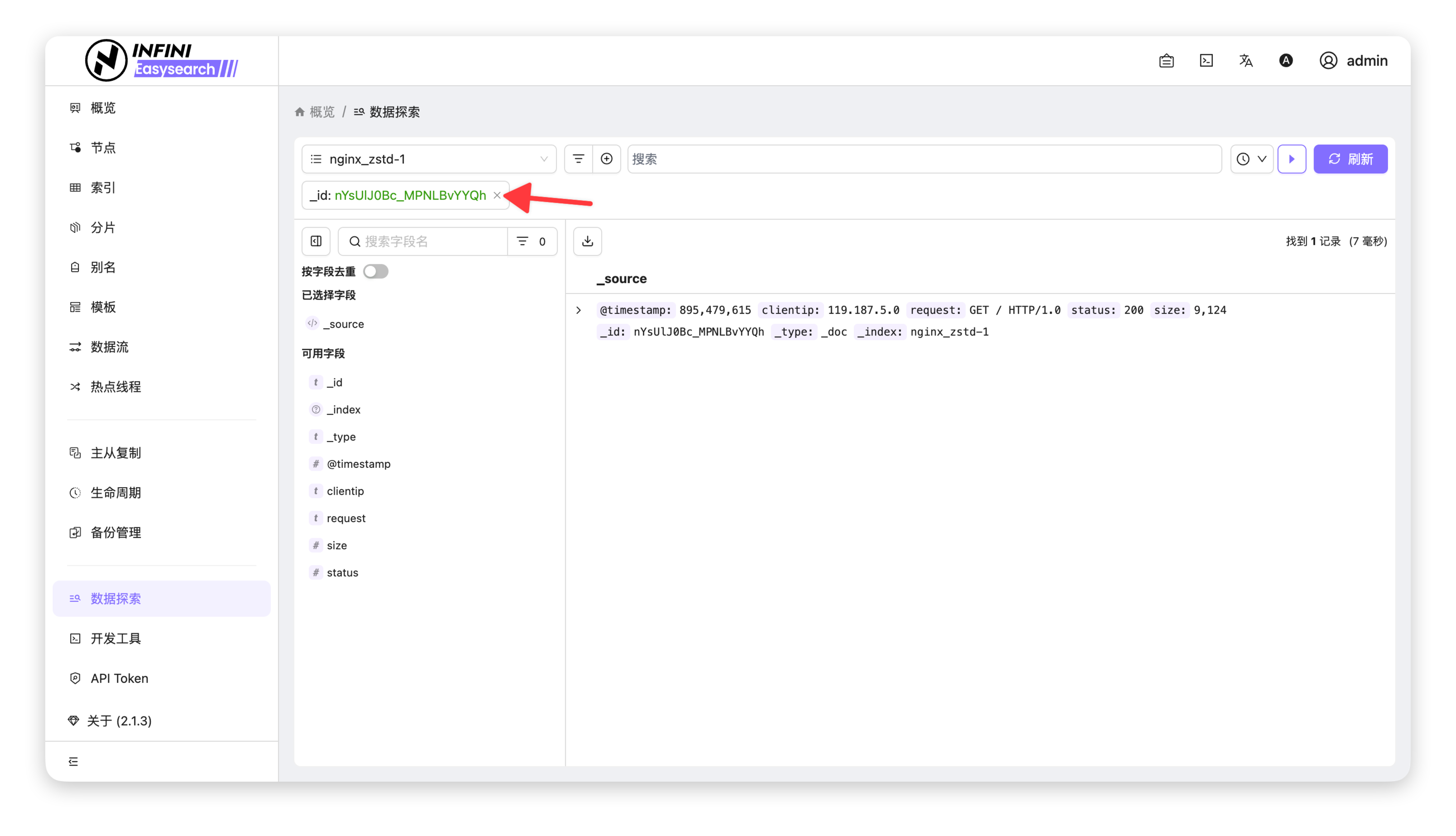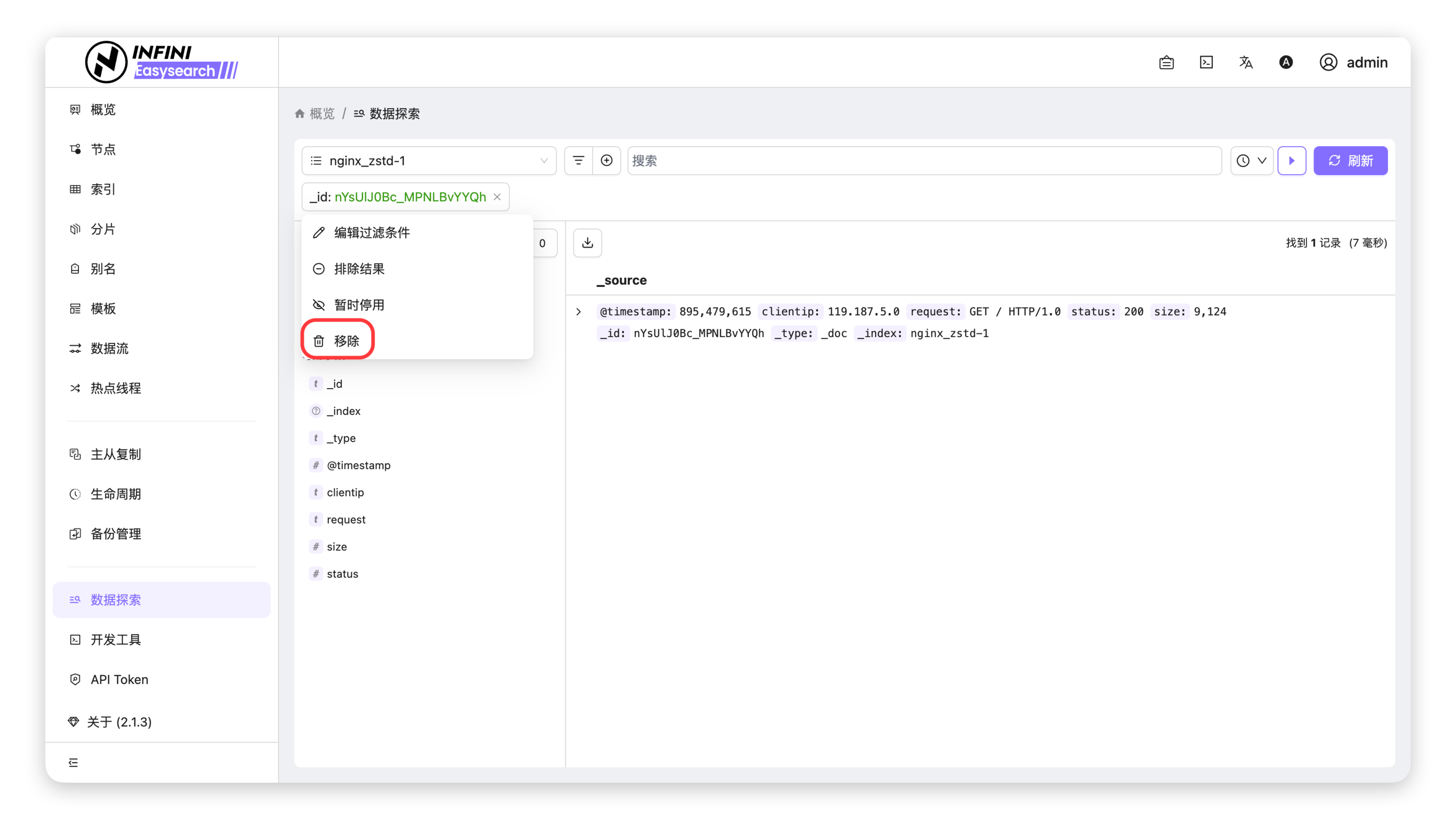 - 查看结果:过滤标签从页面消失,右侧数据列表恢复展示该索引下的全部文档记录。
