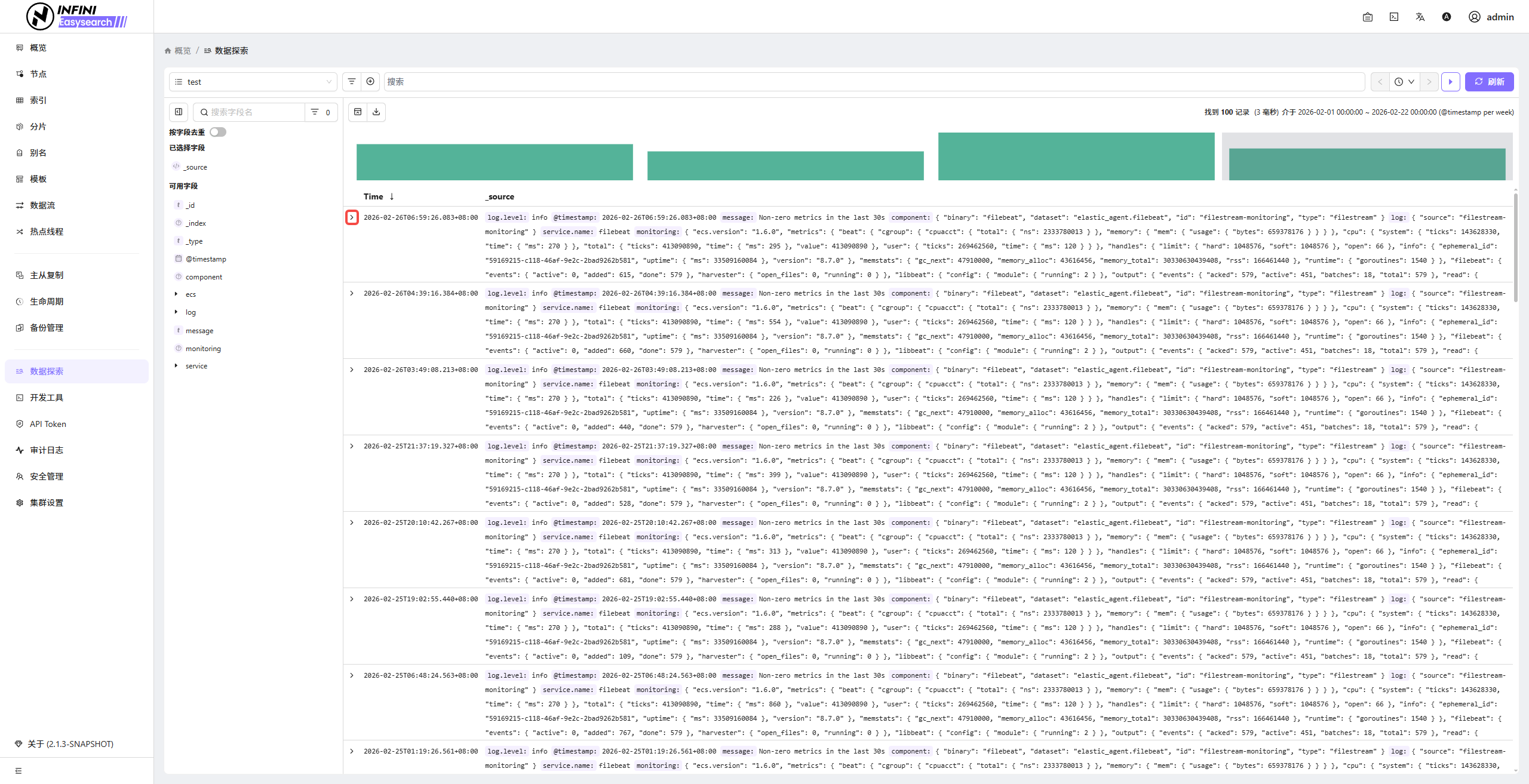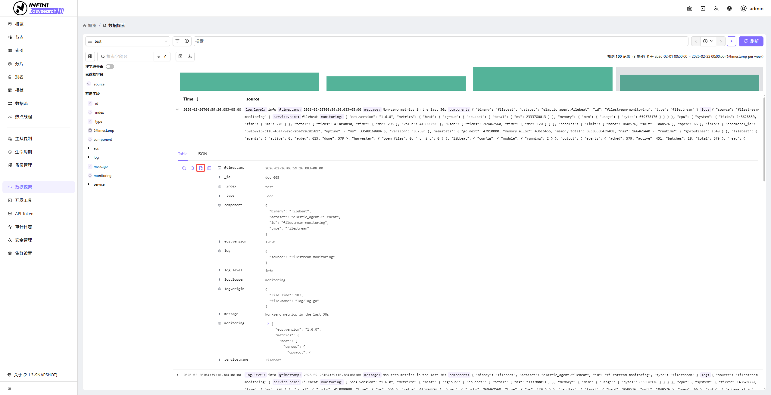 快速新增存在某字段的过滤条件 #可以快速添加一个过滤条件,筛选出包含指定字段的文档。操作步骤 #定位目标字段:在「数据探索」页面左侧的「可用字段」列表中,找到需要新增「存在」过滤条件的目标字段(如 clientip)。新增存在过滤条件:点击目标字段,在弹出的字段面板中,点击「存在」(exists)图标,即可新增一个「存在该字段」的过滤条件。查看过滤结果:新增的过滤条件将自动应用,搜索结果将筛选出包含该字段的记录,过滤条显示在搜索栏下方。