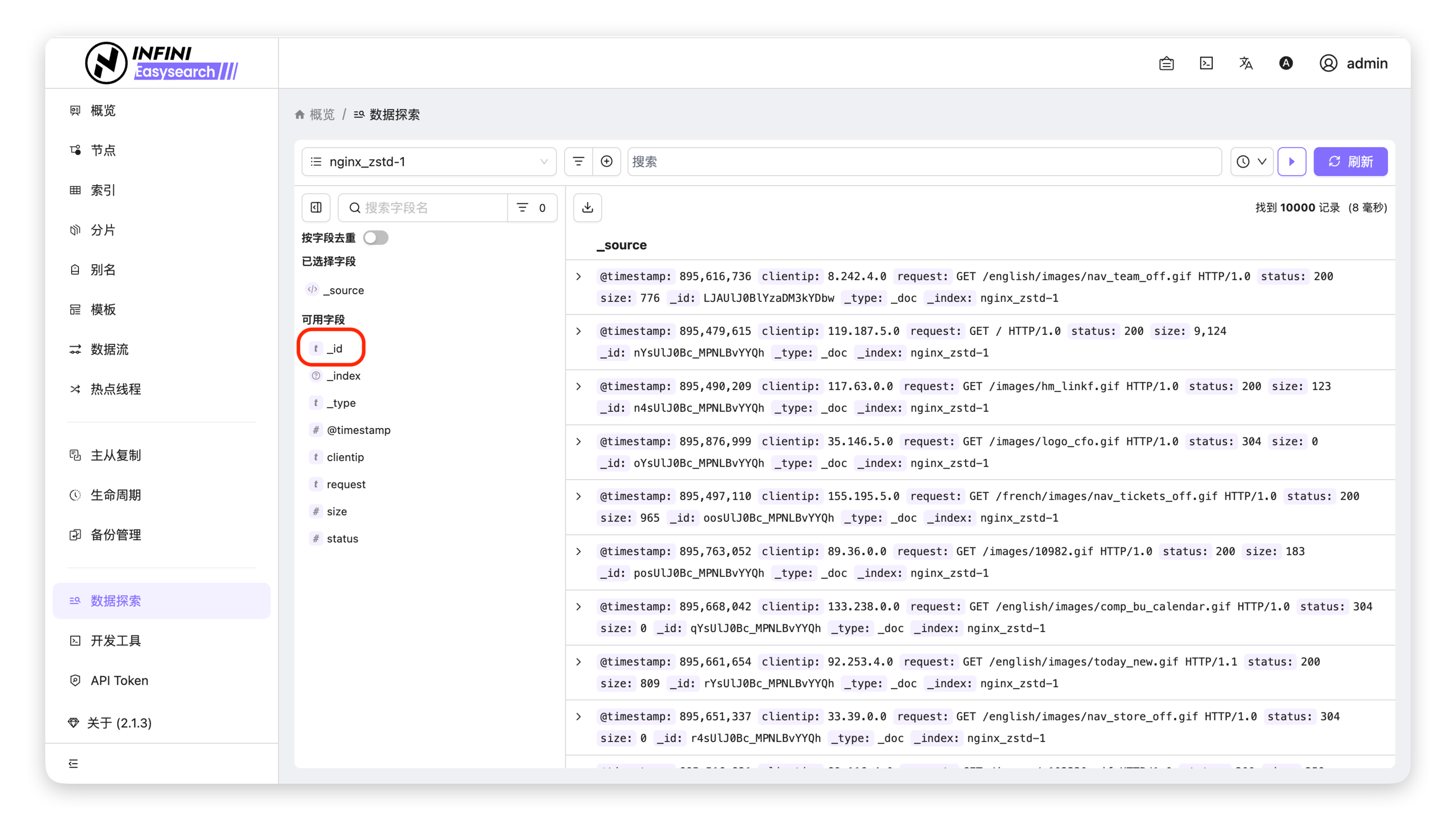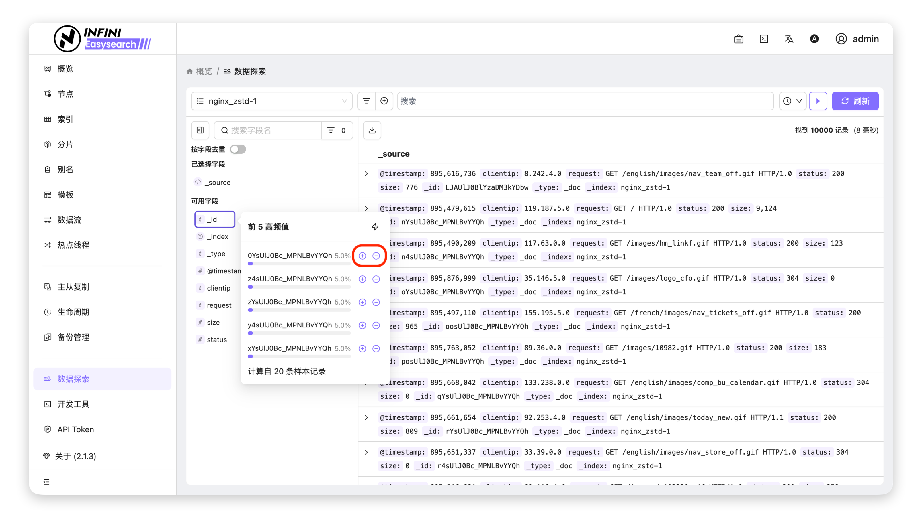 clientip),点击字段名展开字段面板。 - 查看高频值:在字段面板中,点击闪电图标查看该字段的前5个高频值。