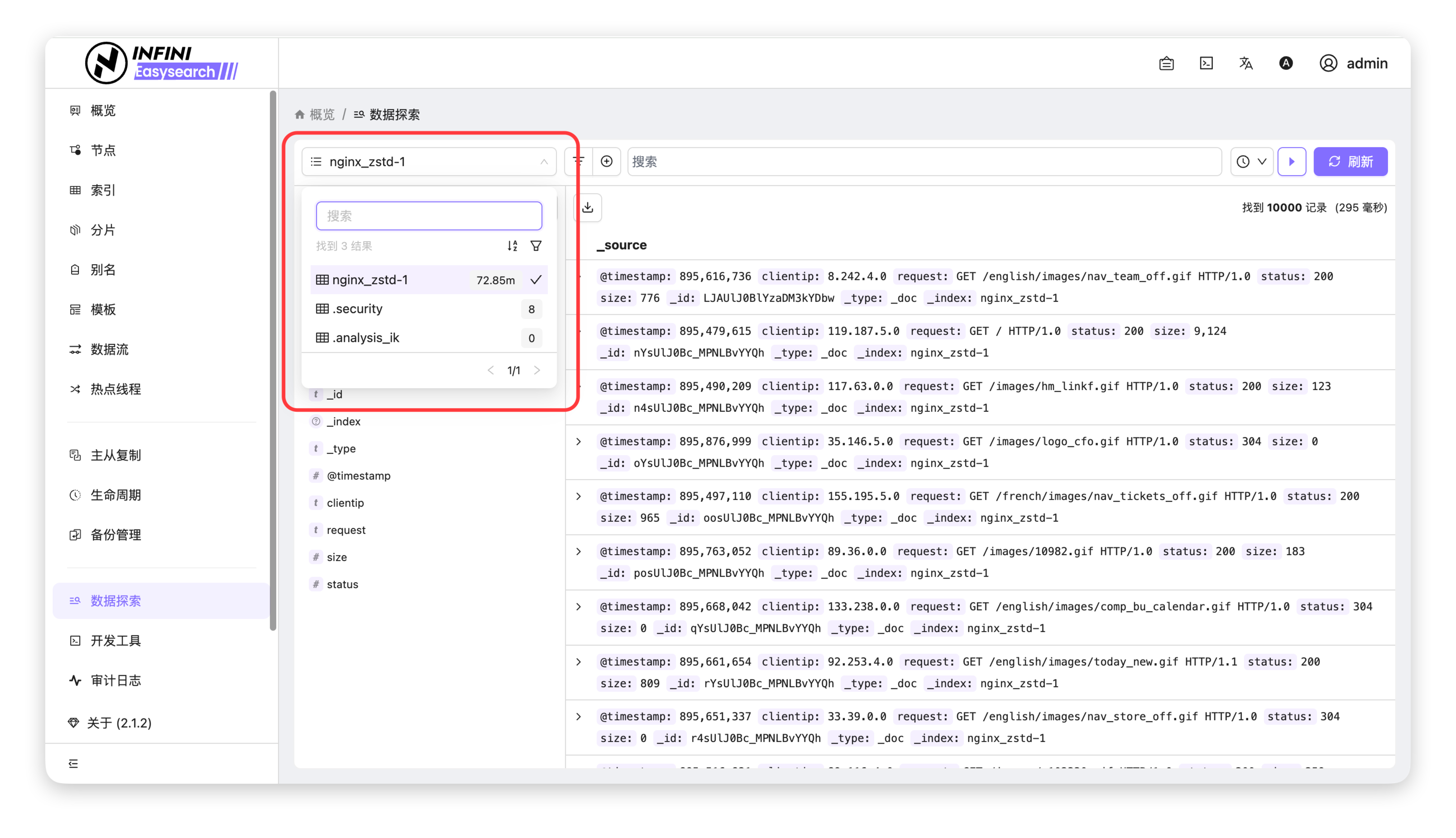 nginx_zstd-1)旁的下拉箭头,展开索引选择列表。 - 选择目标索引:在展开的列表中,点击需要切换的目标索引(如