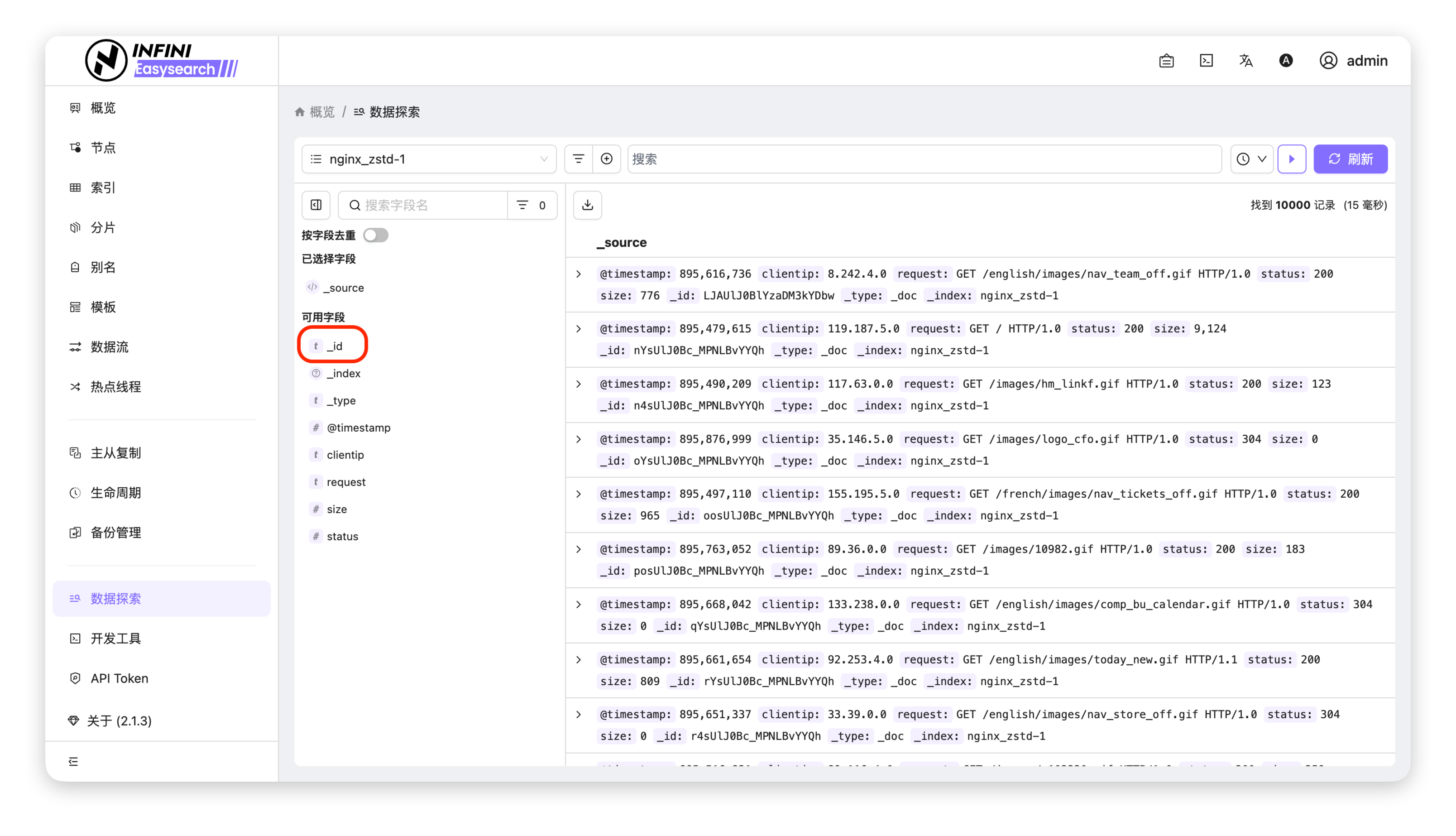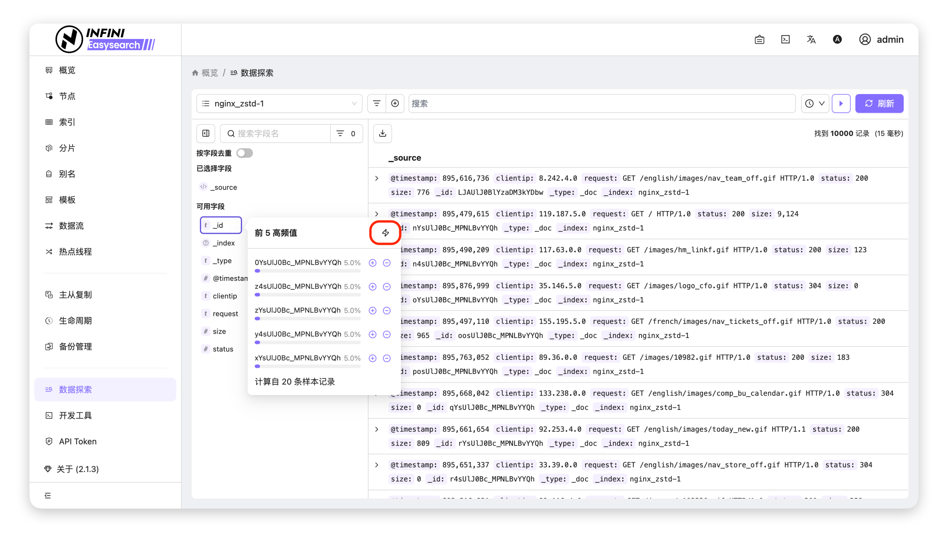 查看字段高频值 #可以查看某个字段中出现频率最高的值及其分布情况。操作步骤 #进入数据探索页面:在左侧导航栏点击「数据探索」,进入对应索引的数据列表页。定位目标字段:在页面左侧「可用字段」列表中,找到需要查看高频值的目标字段(如 _id)。打开高频值面板:点击目标字段,在弹出的面板中点击闪电图标,即可查看该字段的前5个高频值及占比。查看统计结果:面板中会显示字段的高频值、占比,以及统计基于的样本记录数,帮助快速了解字段数据分布。