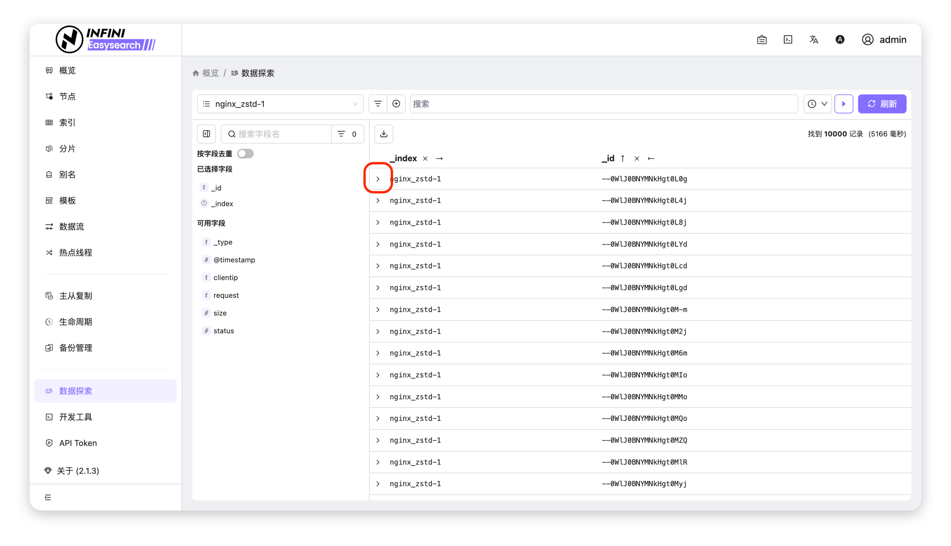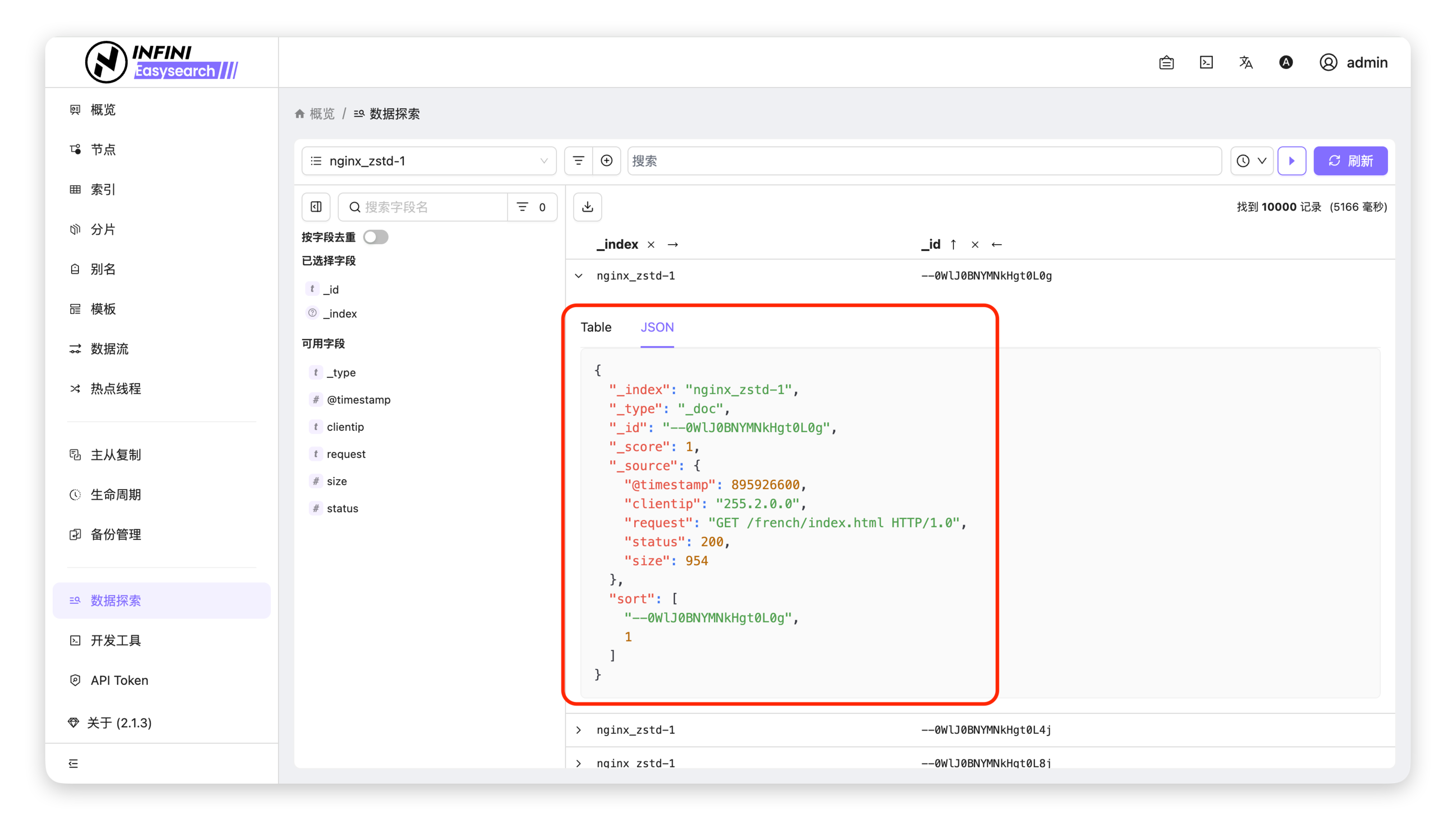 查看表格行完整数据 #可以展开表格中的某一行,查看该文档的所有字段和完整数据。操作步骤 #展开行详情:在「数据探索」页面的数据表格中,点击目标行左侧的「展开」图标(▶),展开该行的完整数据详情。查看完整数据:展开后,可以看到该行记录的所有字段和值,包括表格中未显示的字段。切换视图:支持在「Table」(表格)和「JSON」视图之间切换,方便查看原始 JSON 格式的文档数据。