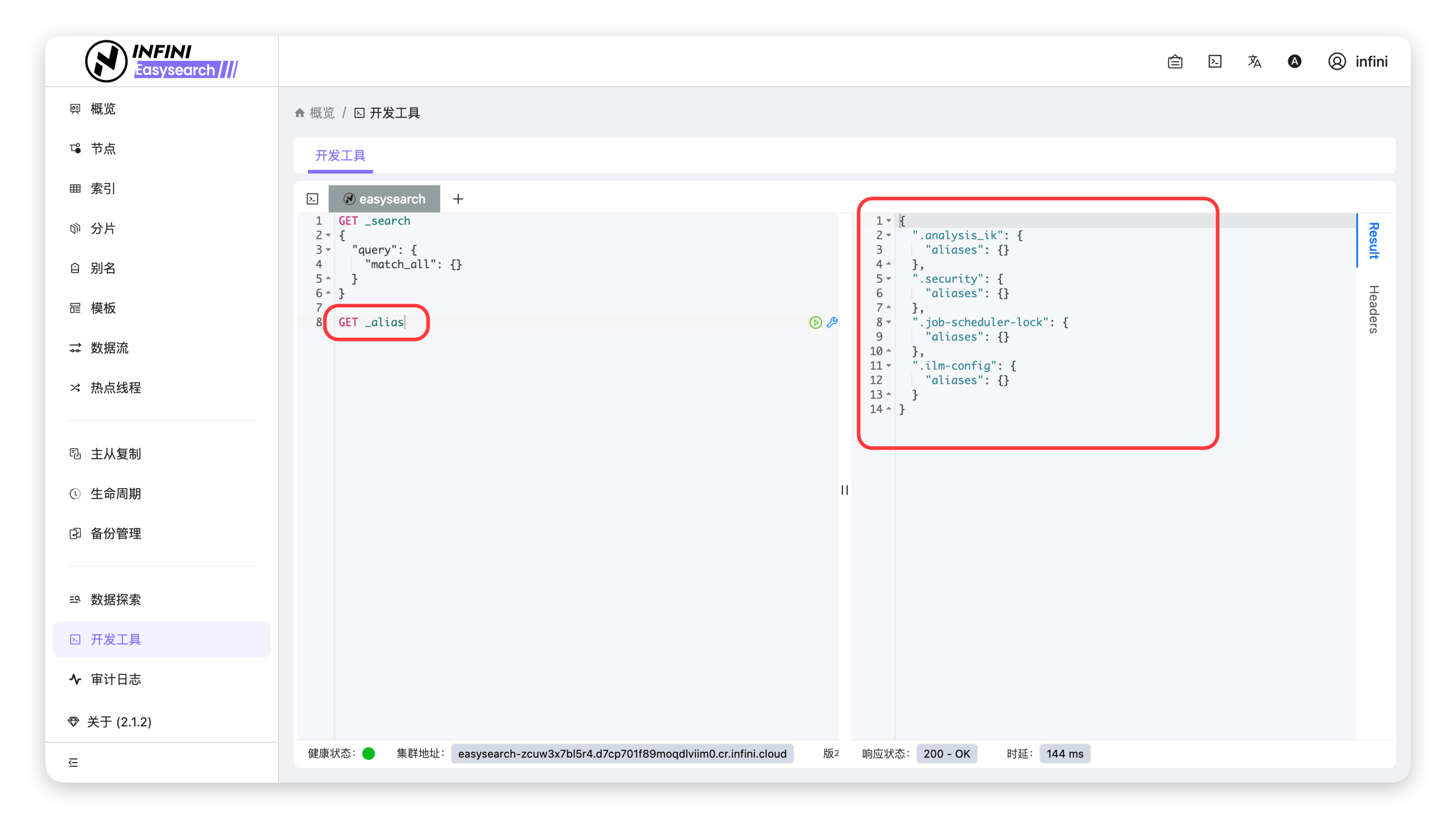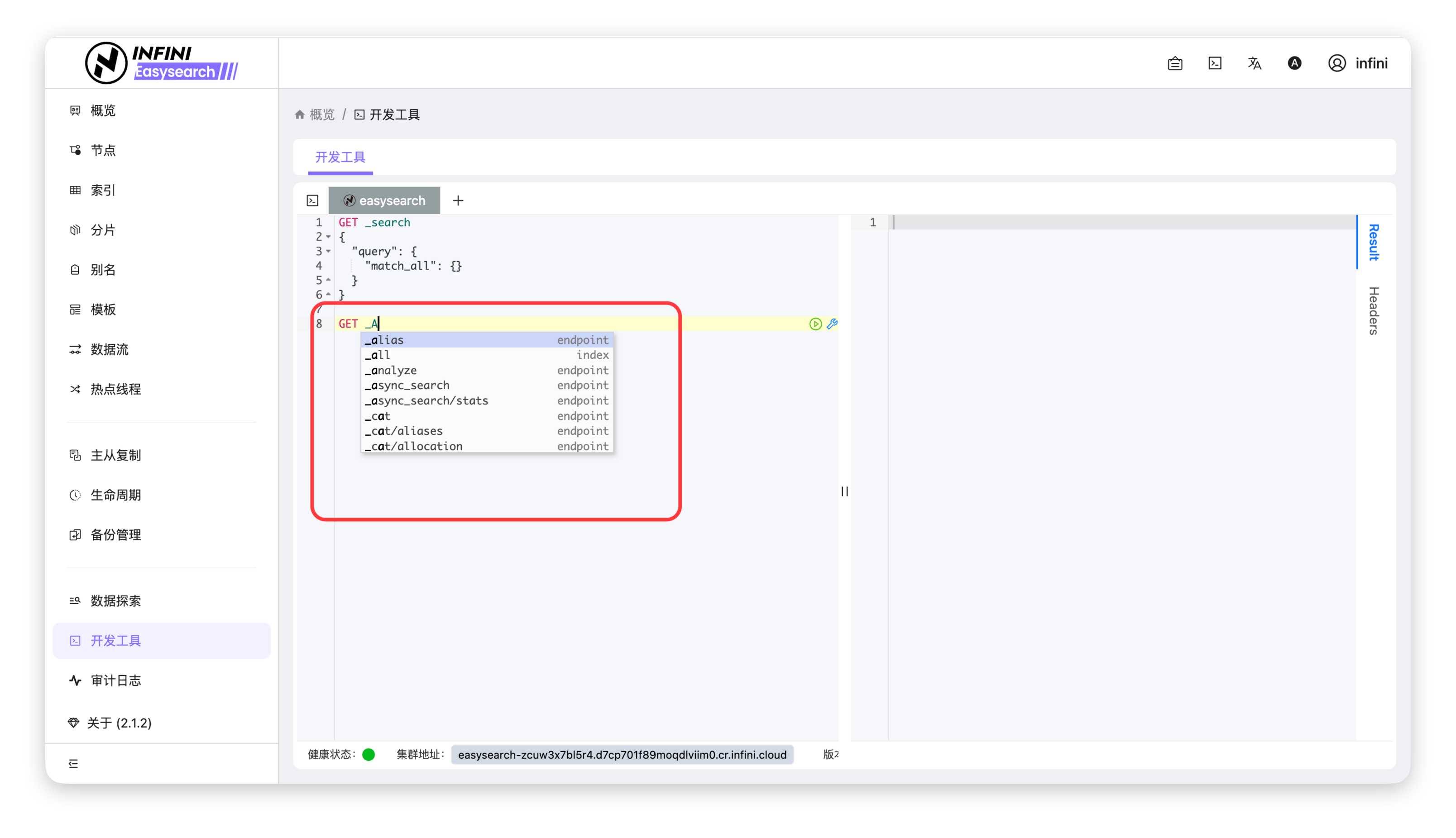 API 智能提示 #操作步骤 #进入开发工具页面:在左侧导航栏点击「开发工具」,进入开发工具编辑页。触发智能补全:在左侧编辑区输入请求语句时,系统将自动弹出 API 提示列表,展示匹配的接口端点、索引等选项。选择并补全语句:在提示列表中点击目标接口(示例为 _alias),自动补全完整的请求语句。发送请求并查看结果:补全完成后,点击运行按钮发送请求,在右侧「Result」标签页查看接口响应结果。