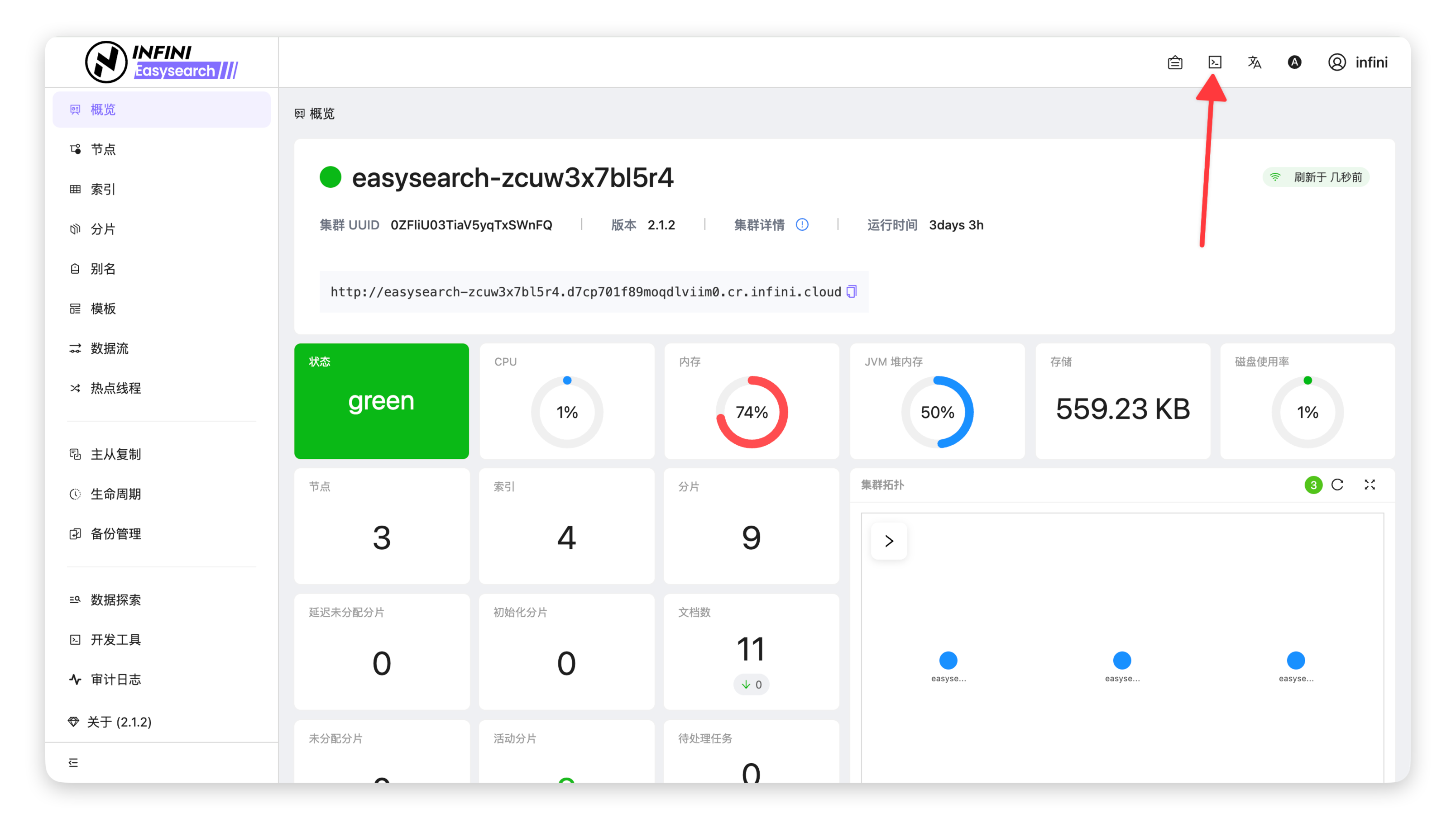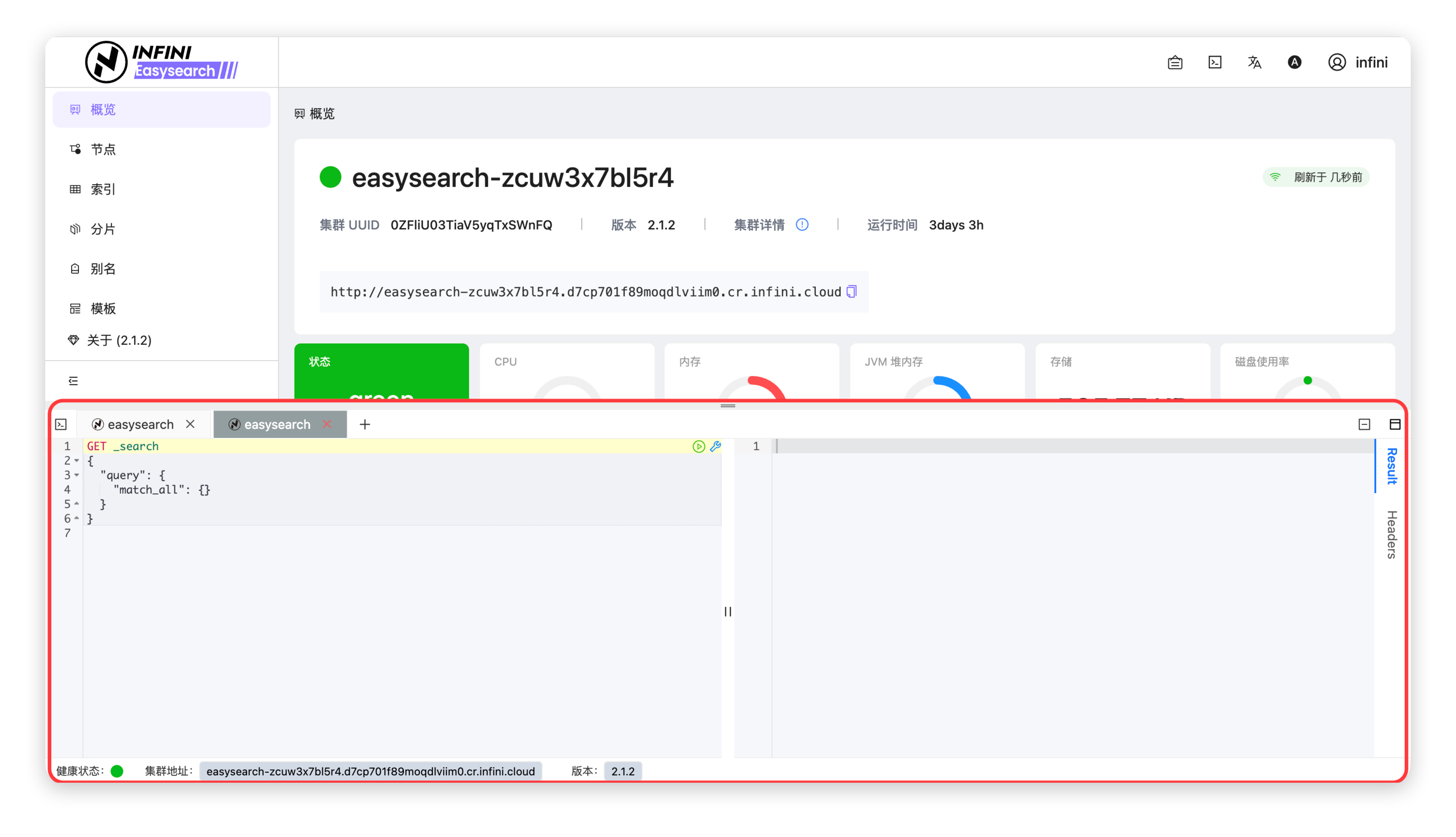 • 悬浮窗口可在任意页面(如概览、索引管理等)快速唤起,无需切换至开发工具页面,适合在运维操作中临时执行查询或调试。