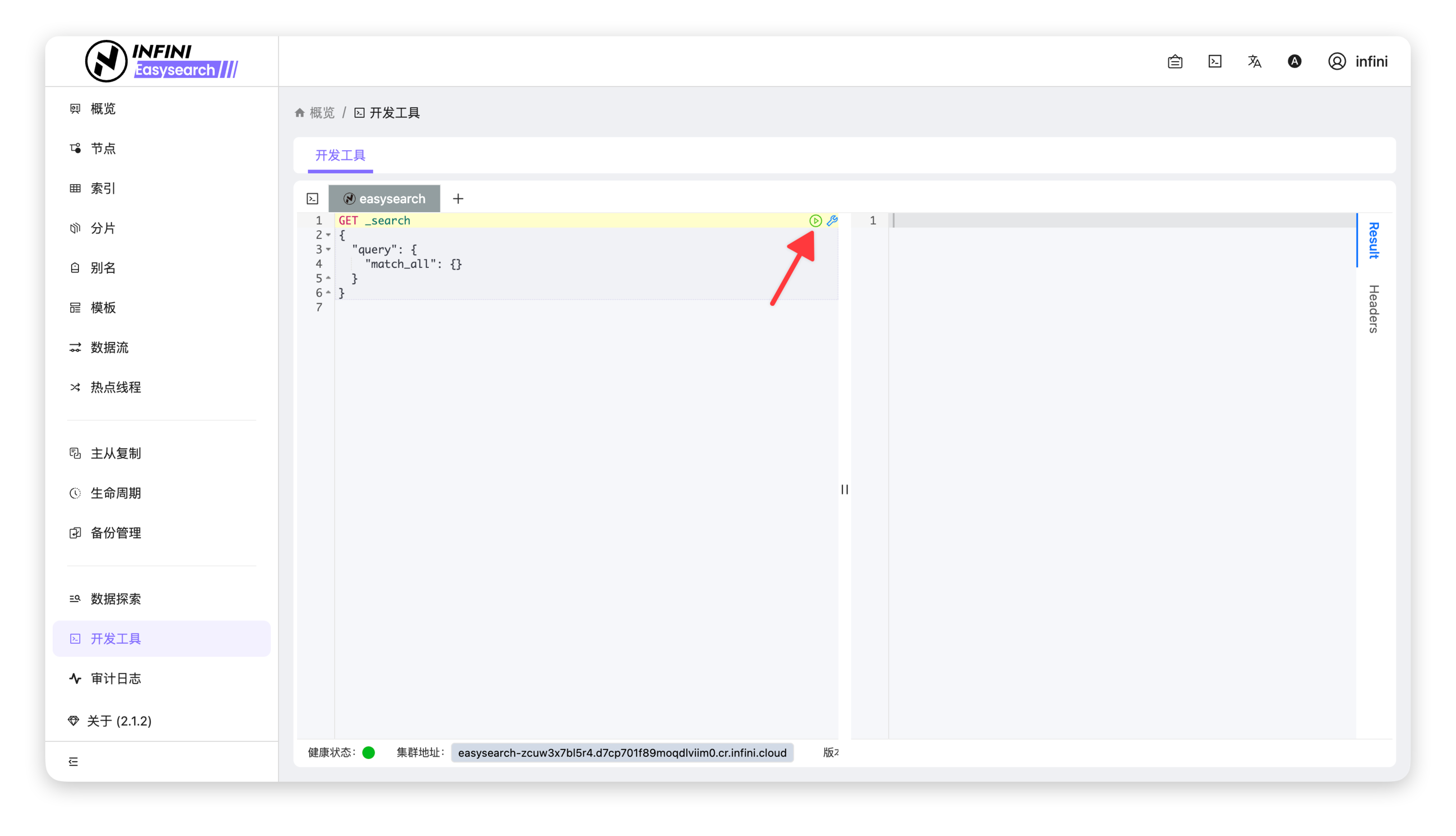 2. 编写请求语句:在左侧编辑区输入符合规范的请求语句(示例为 GET _search 查询语句)。