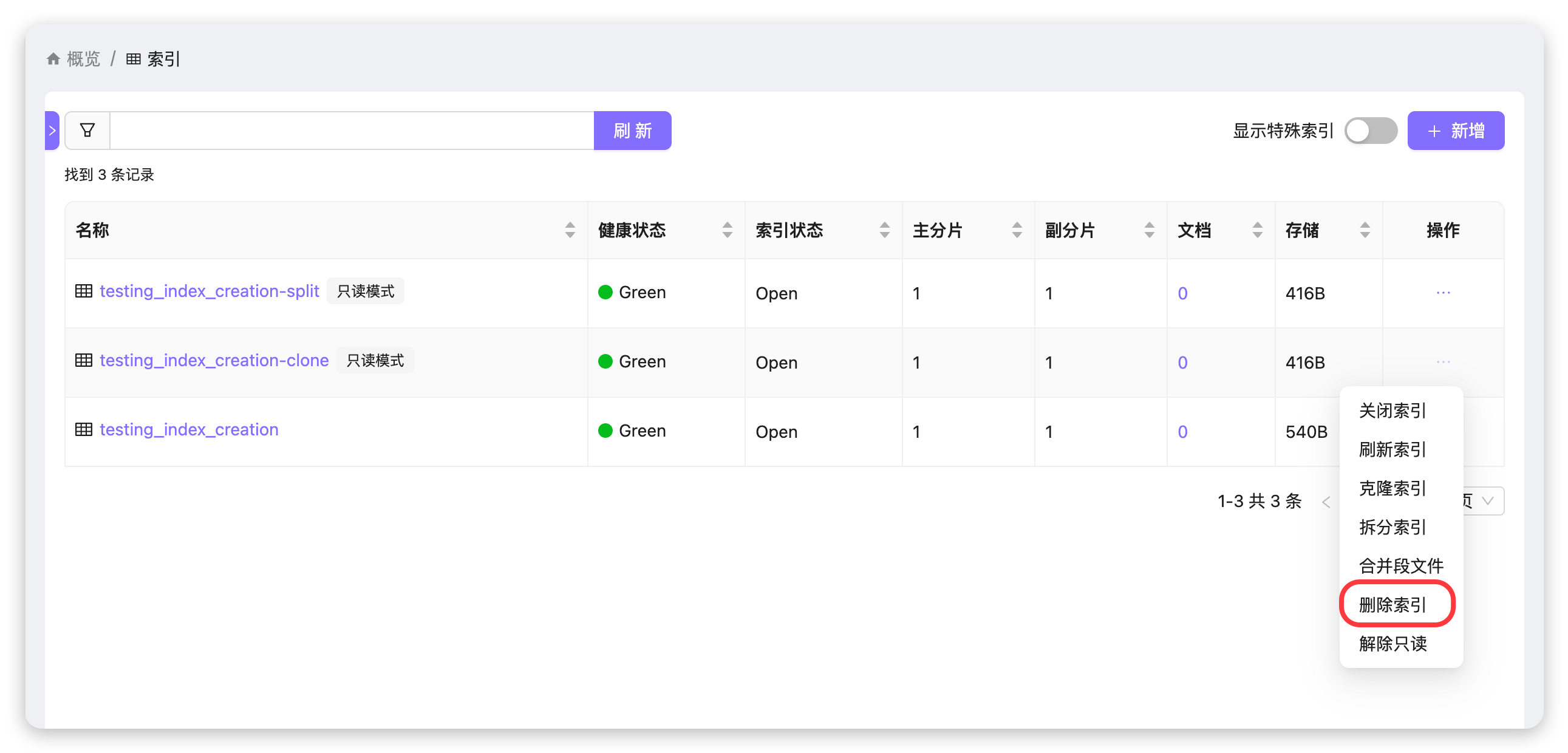 testing_index_creation-clone)。打开操作菜单:点击该索引行「操作」列的更多按钮(