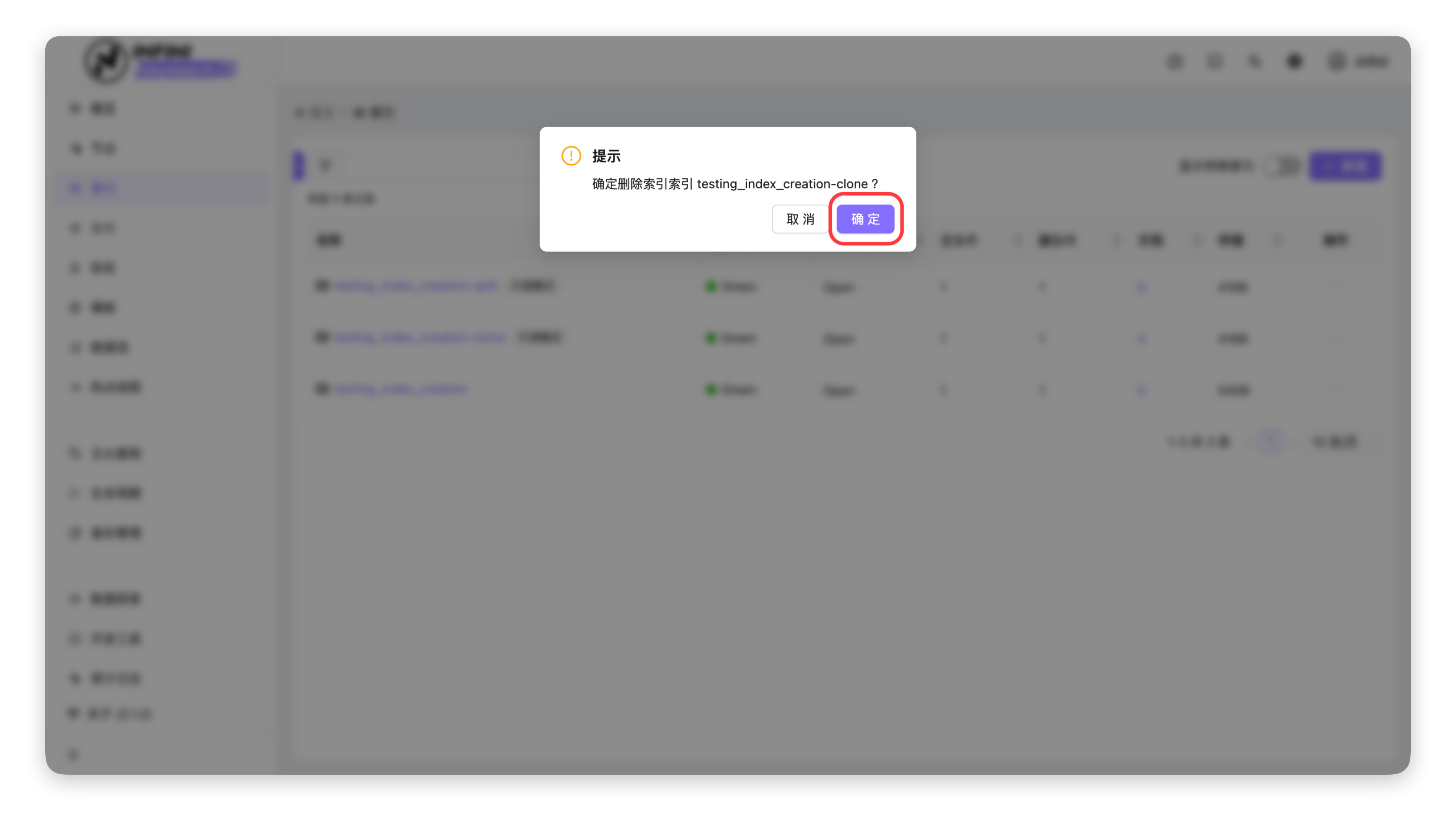 - 确认删除:在弹出的确认提示框中,点击「确定」,系统将执行索引删除操作。