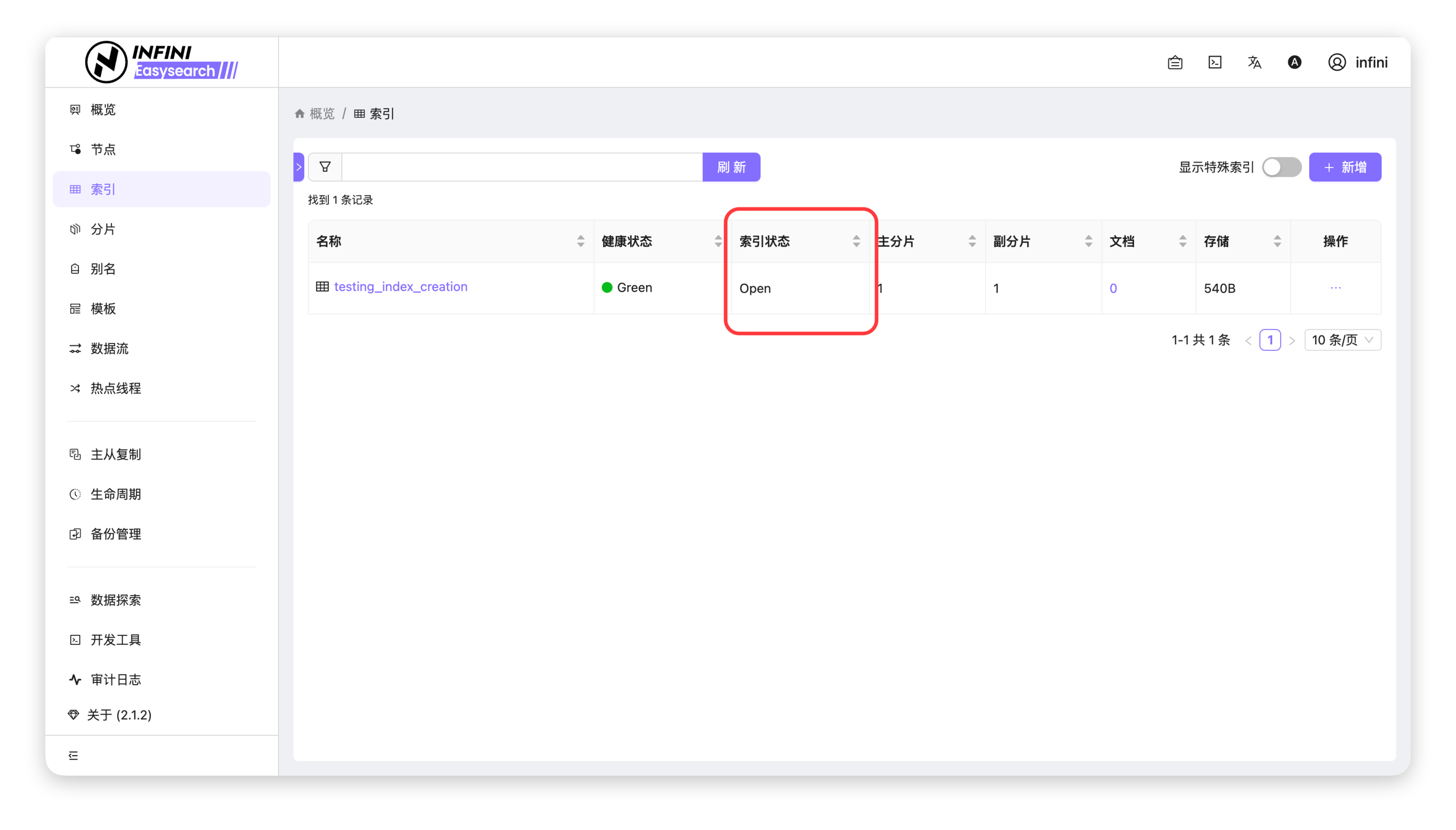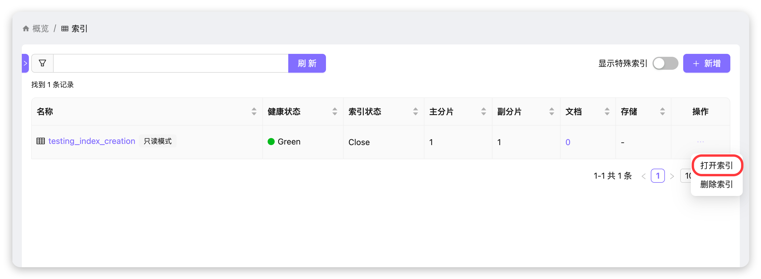 1. 进入索引列表:在「索引」页面,找到状态为 Close(已关闭)的目标索引(如 testing_index_creation)。