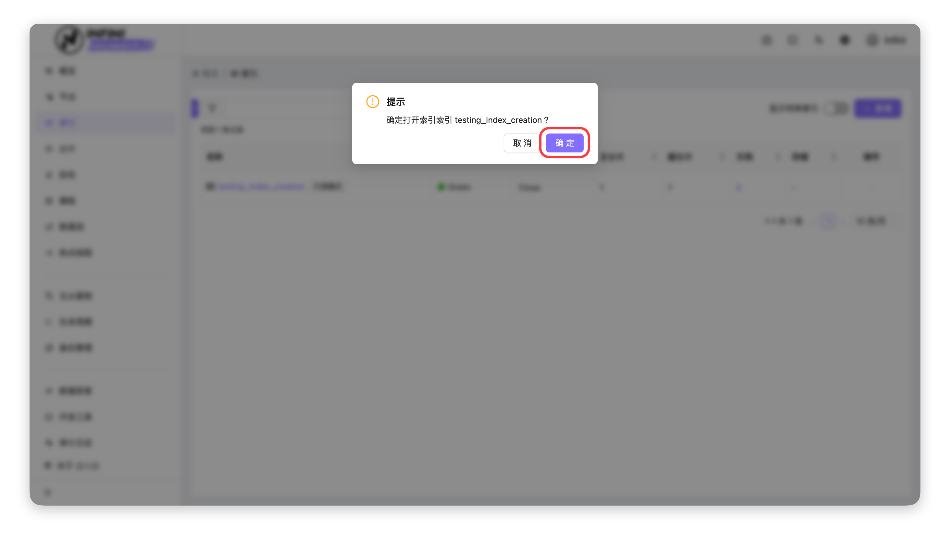 1. 确认打开操作:在弹出的确认提示框中,点击「确定」,系统将执行索引打开操作。
