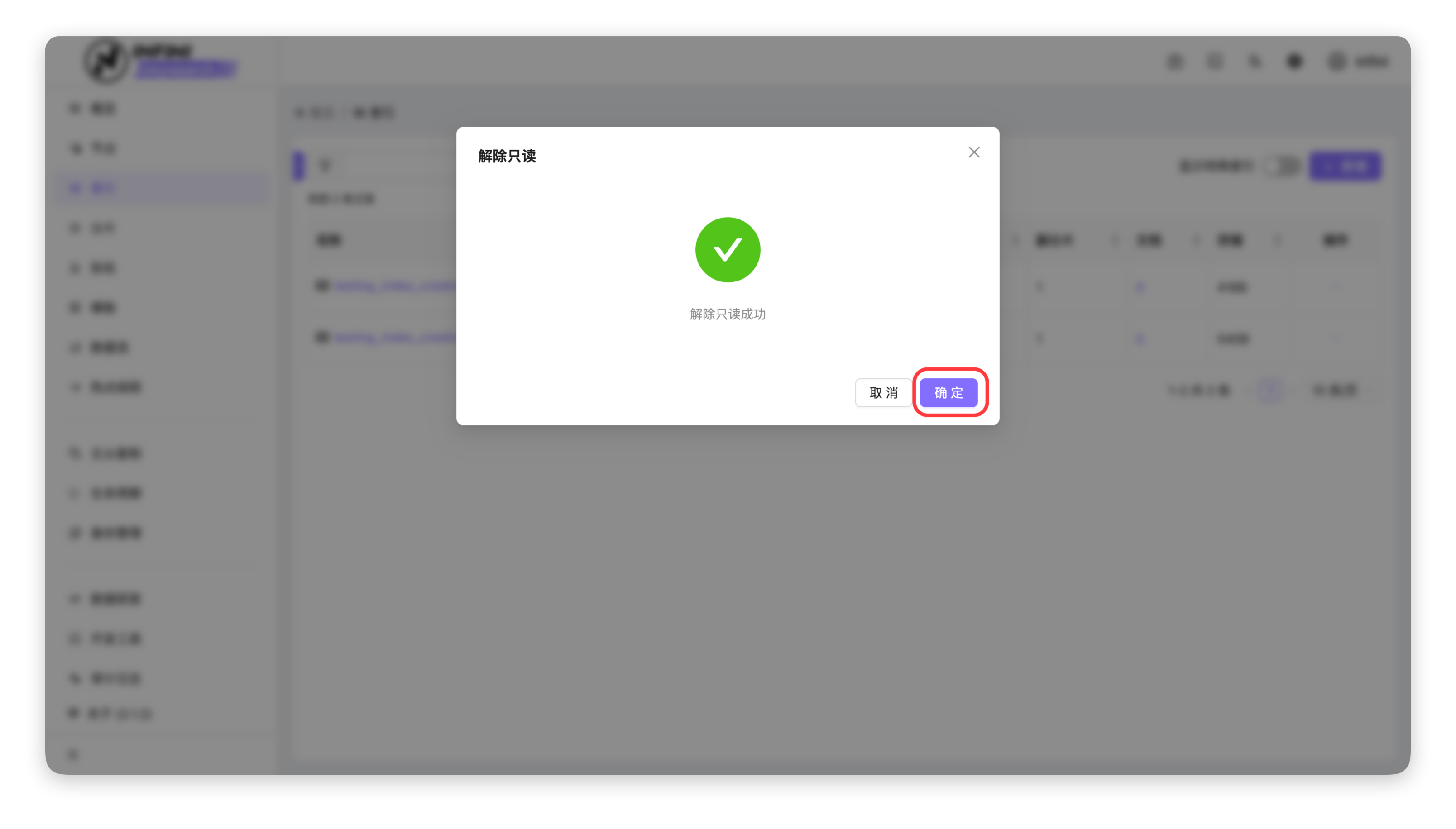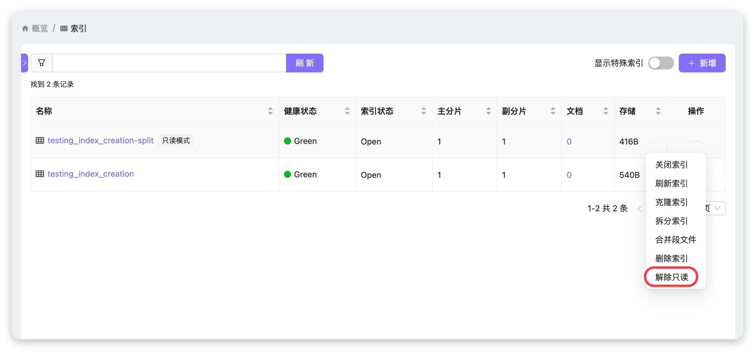 1. 查看结果:操作完成后,索引列表中该索引的「只读模式」标识消失,代表索引已恢复正常读写状态。