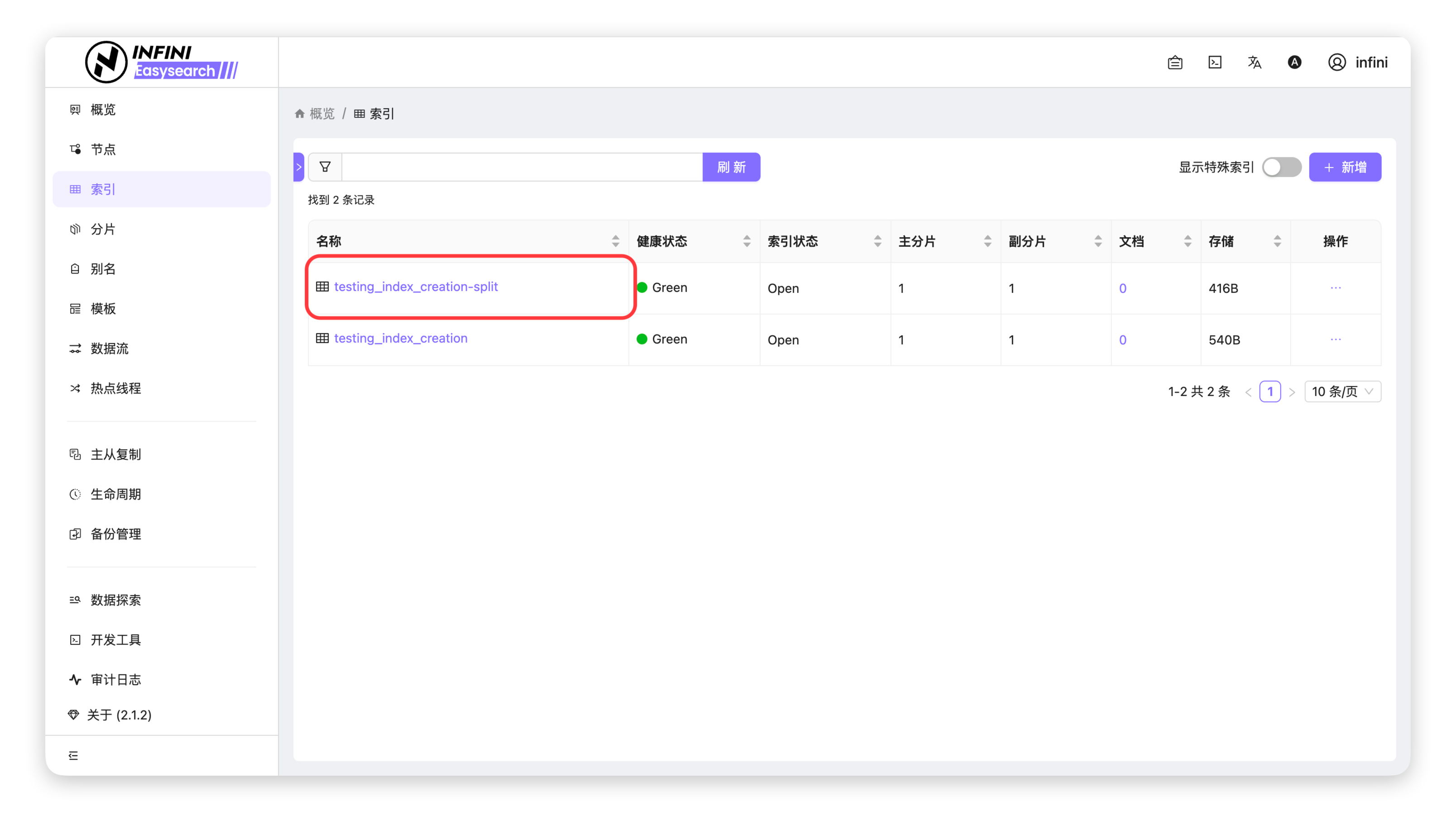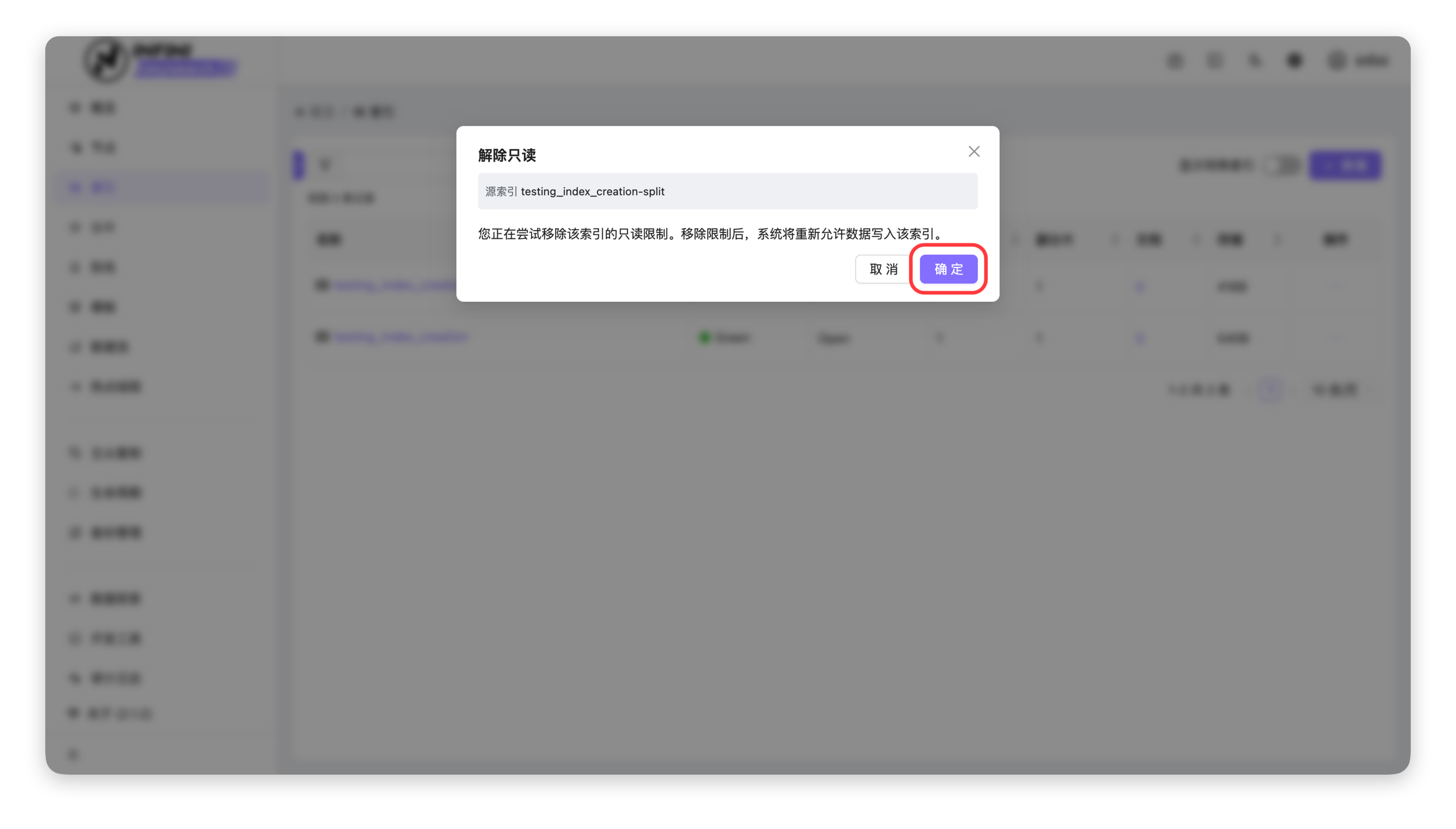 1. 进入索引列表:在「索引」页面,找到处于只读模式的目标索引(如 testing_index_creation-split)。