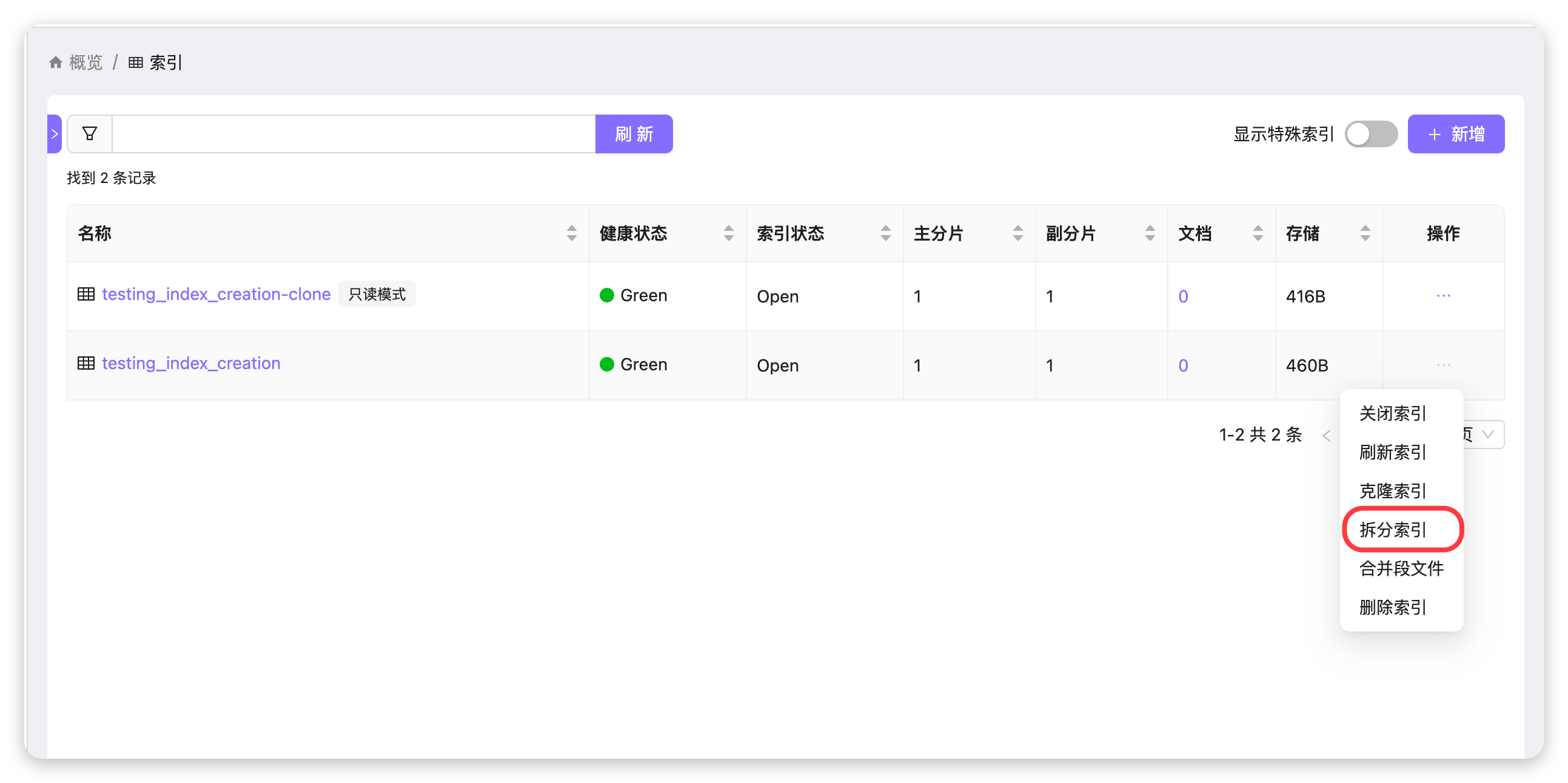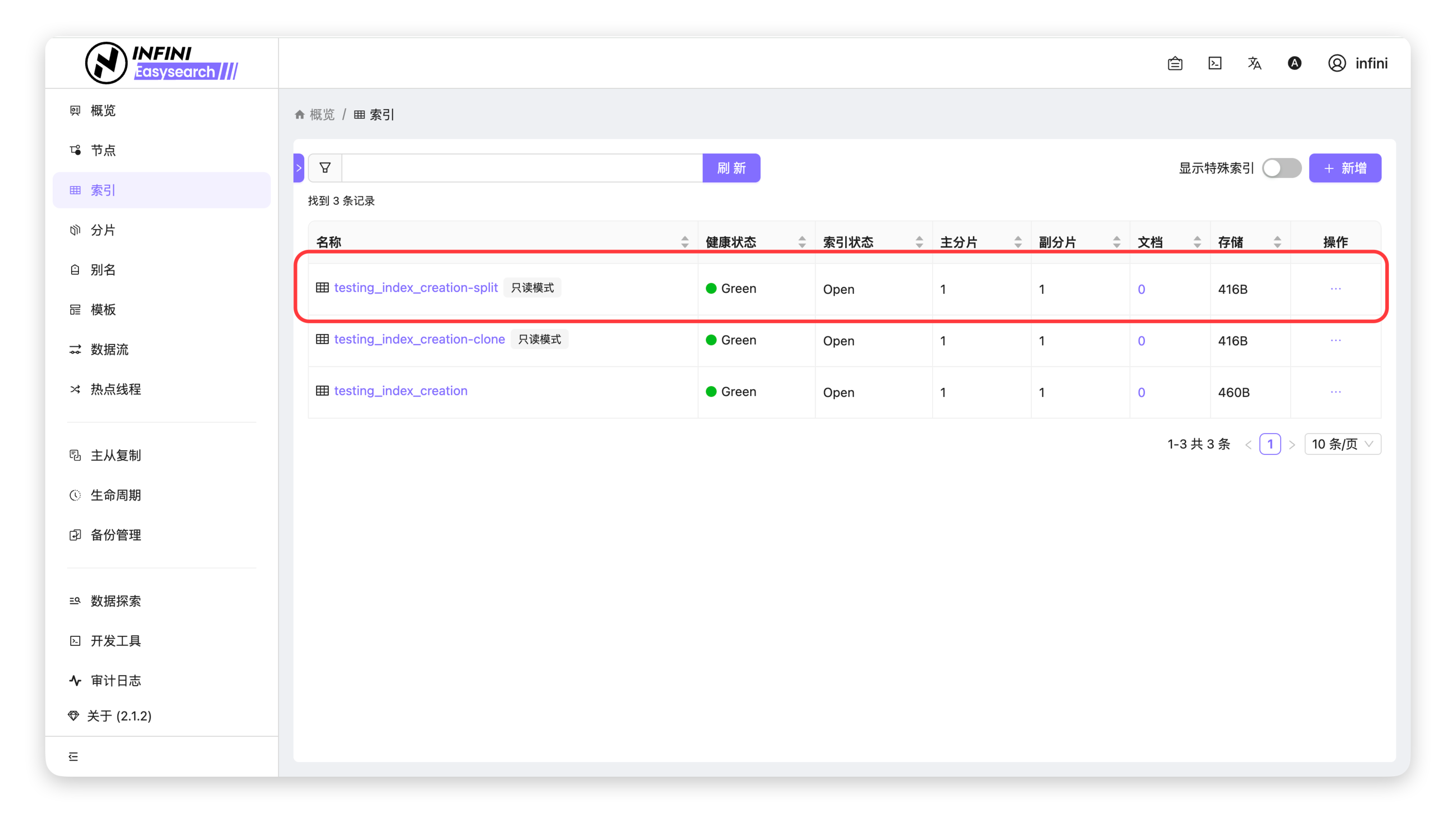 1. 进入索引列表:在「索引」页面,找到需要拆分的源索引(如 testing_index_creation)。