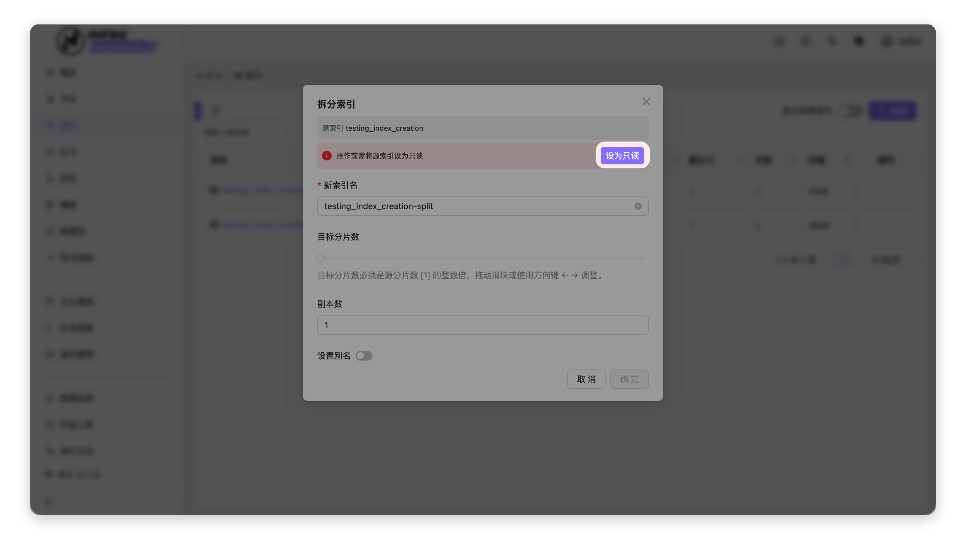 1. 完成前置只读设置:在弹出的「拆分索引」窗口中,点击「设为只读」,将源索引切换为只读状态,确保拆分过程数据一致。