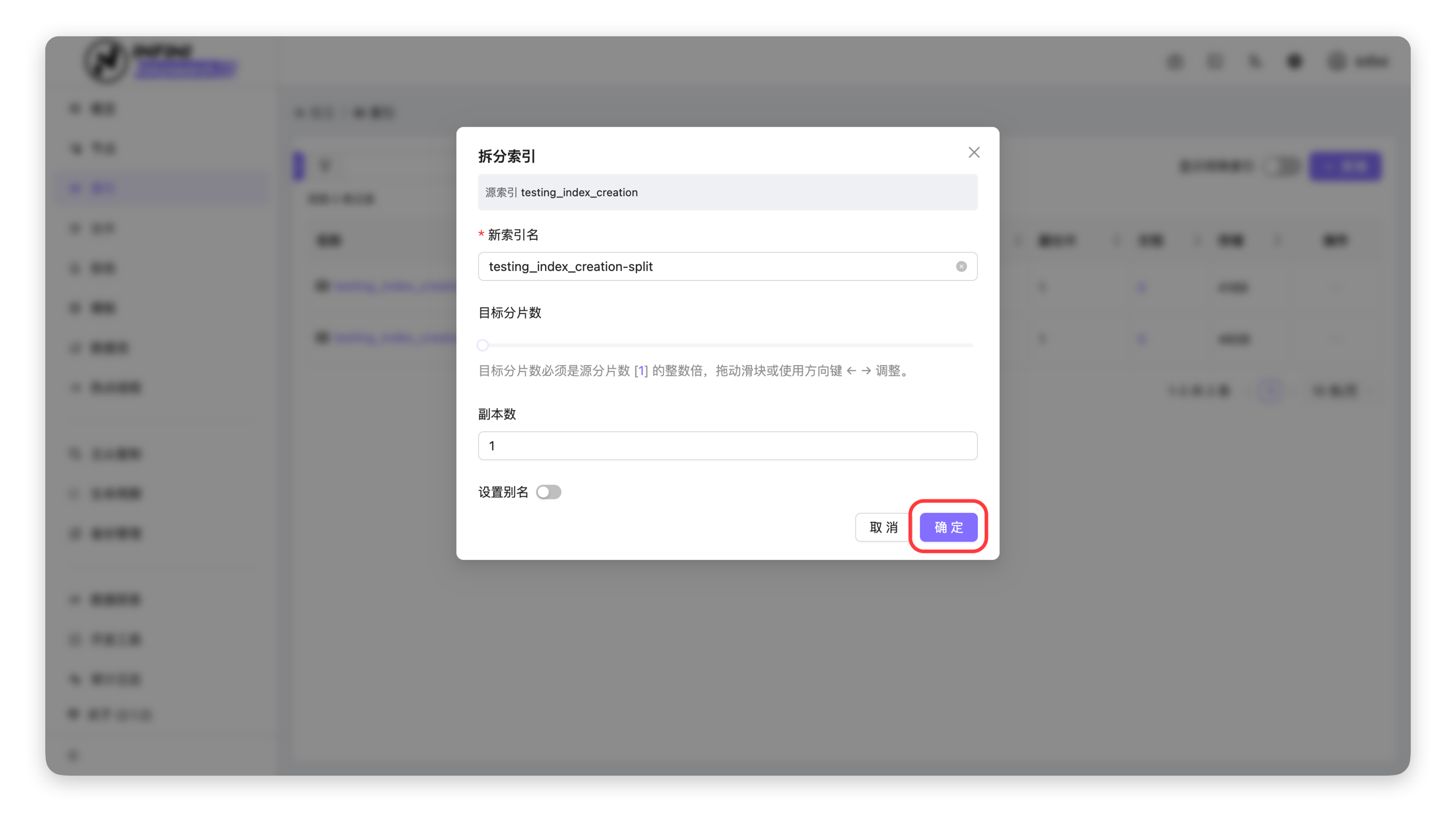 • 目标分片数:设置新索引的分片数(必须为源索引分片数的整数倍,可通过滑块或方向键调整)。