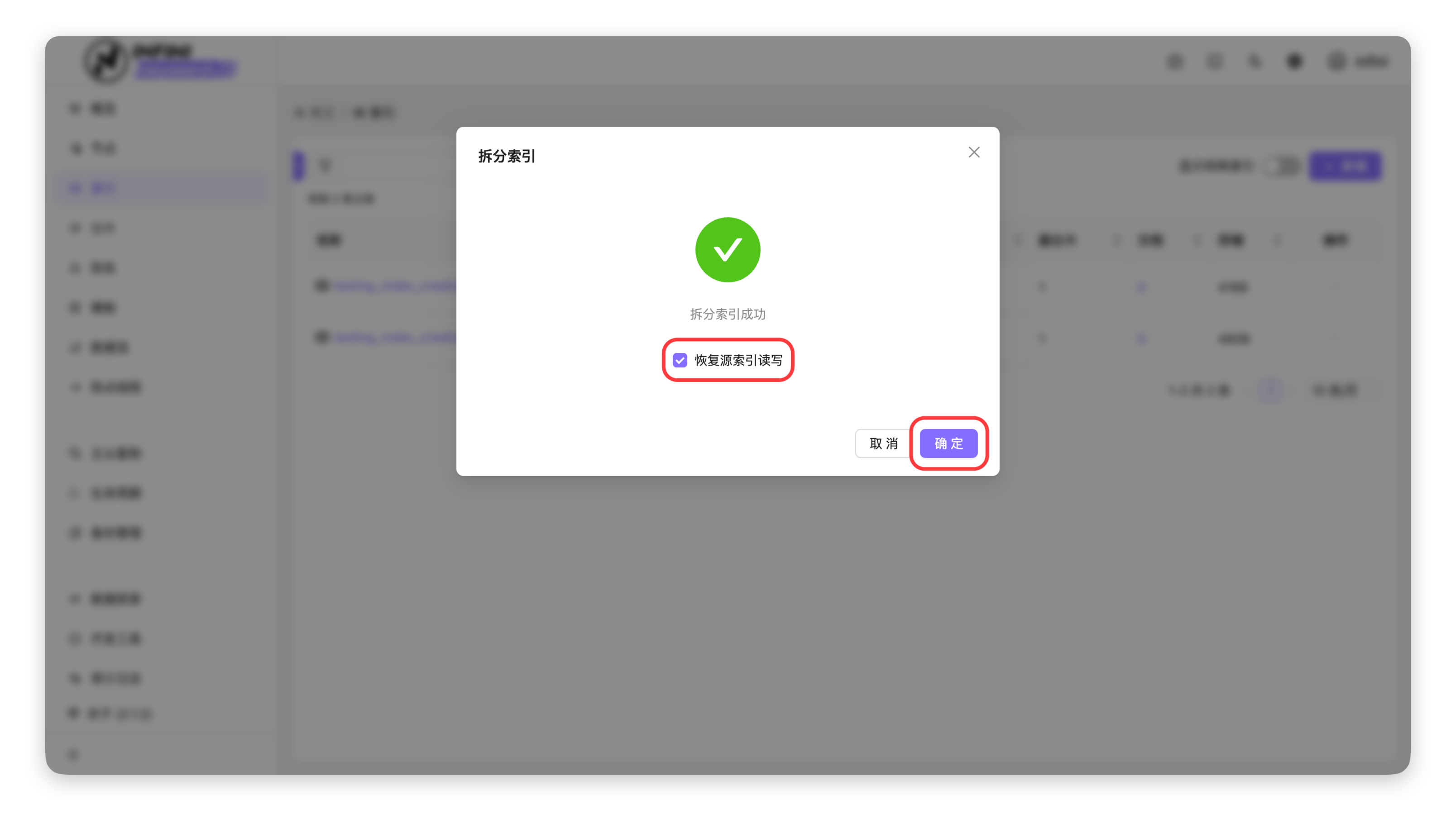 1. 恢复源索引读写:拆分成功后,在提示窗口中勾选「恢复源索引读写」,点击「确定」,将源索引恢复为正常读写状态。