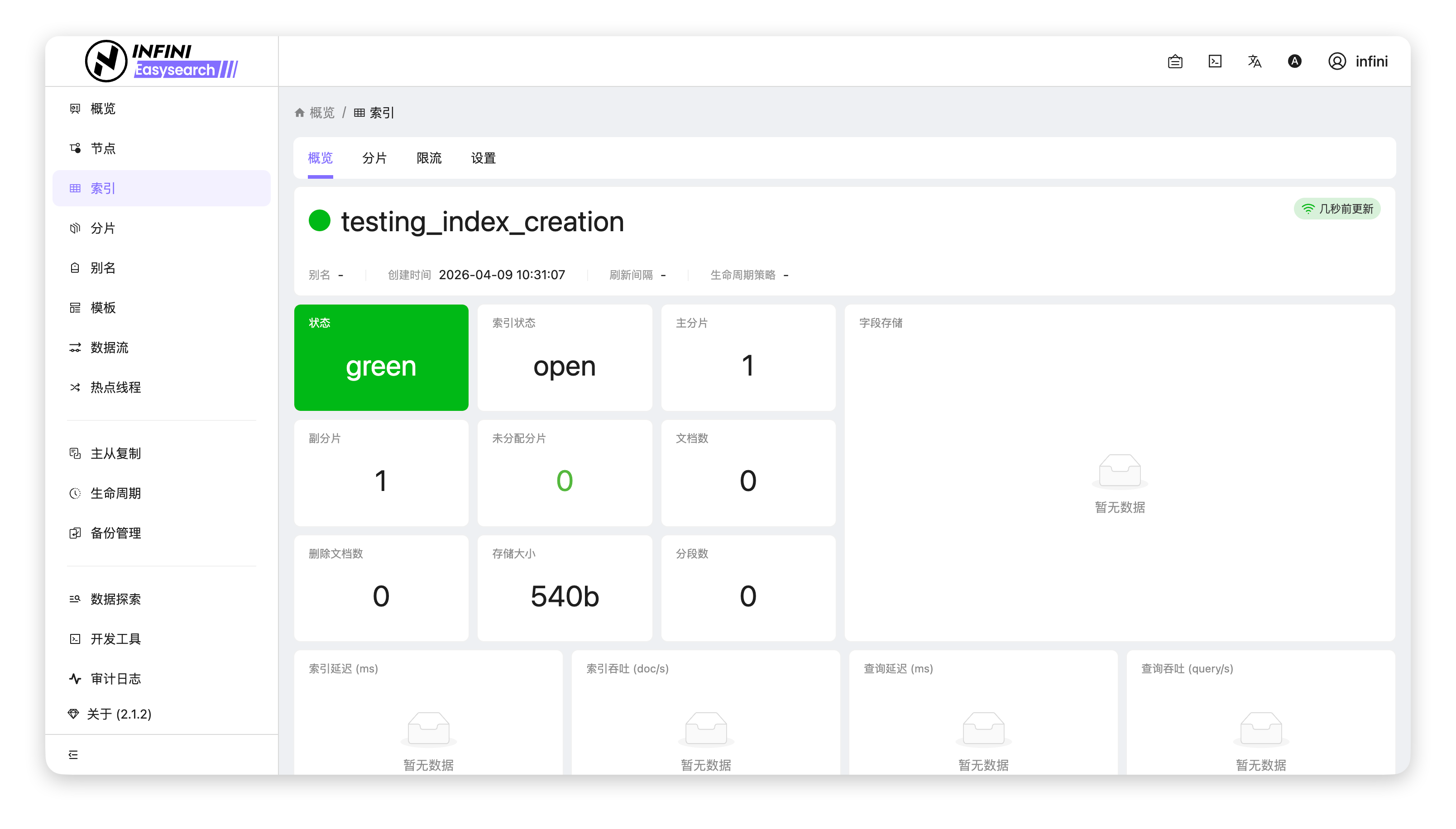 1. 进入索引列表:在「索引」页面,找到需要查看详情的目标索引(如 testing_index_creation)。