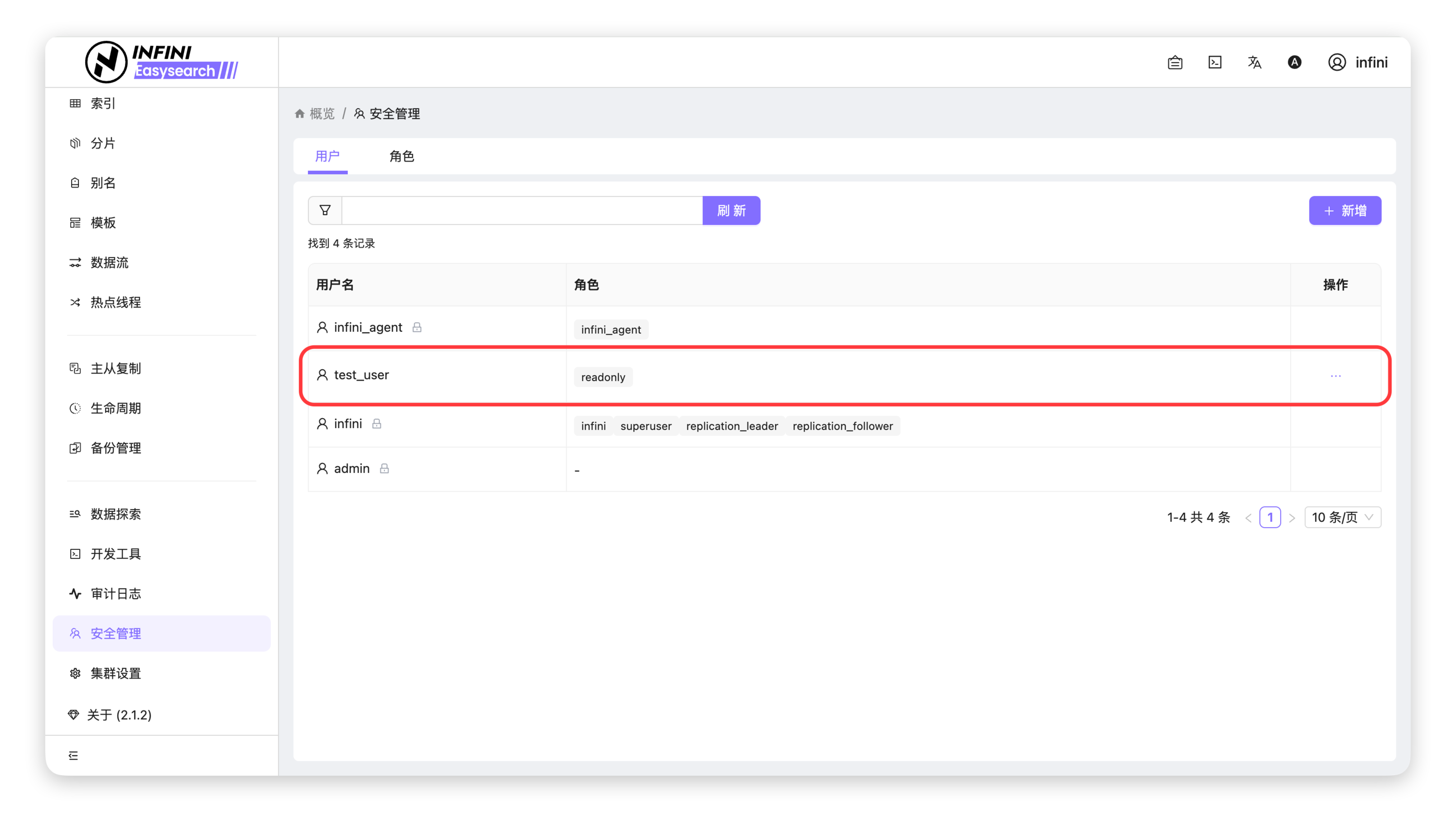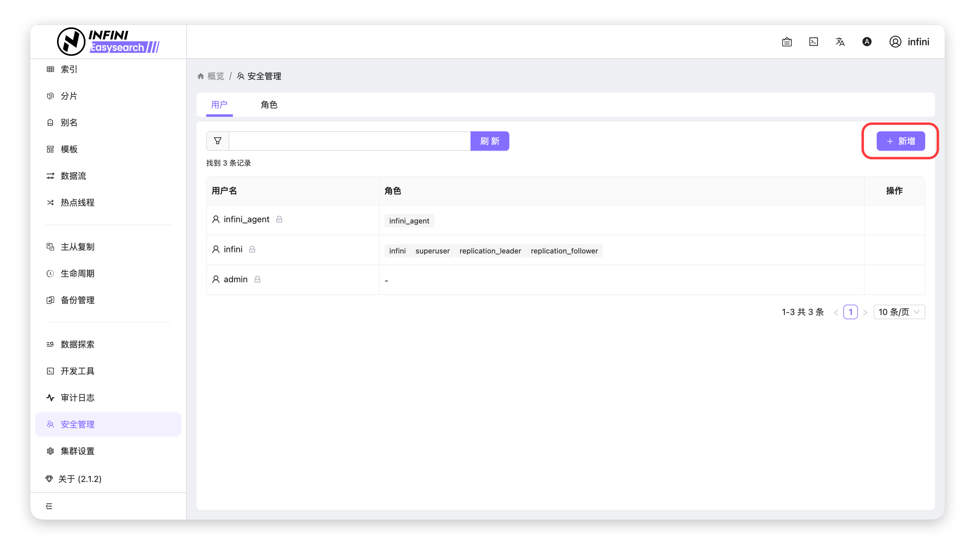 进入安全管理页面:在左侧导航栏点击「安全管理」,默认进入「用户」标签页,可查看现有用户列表。