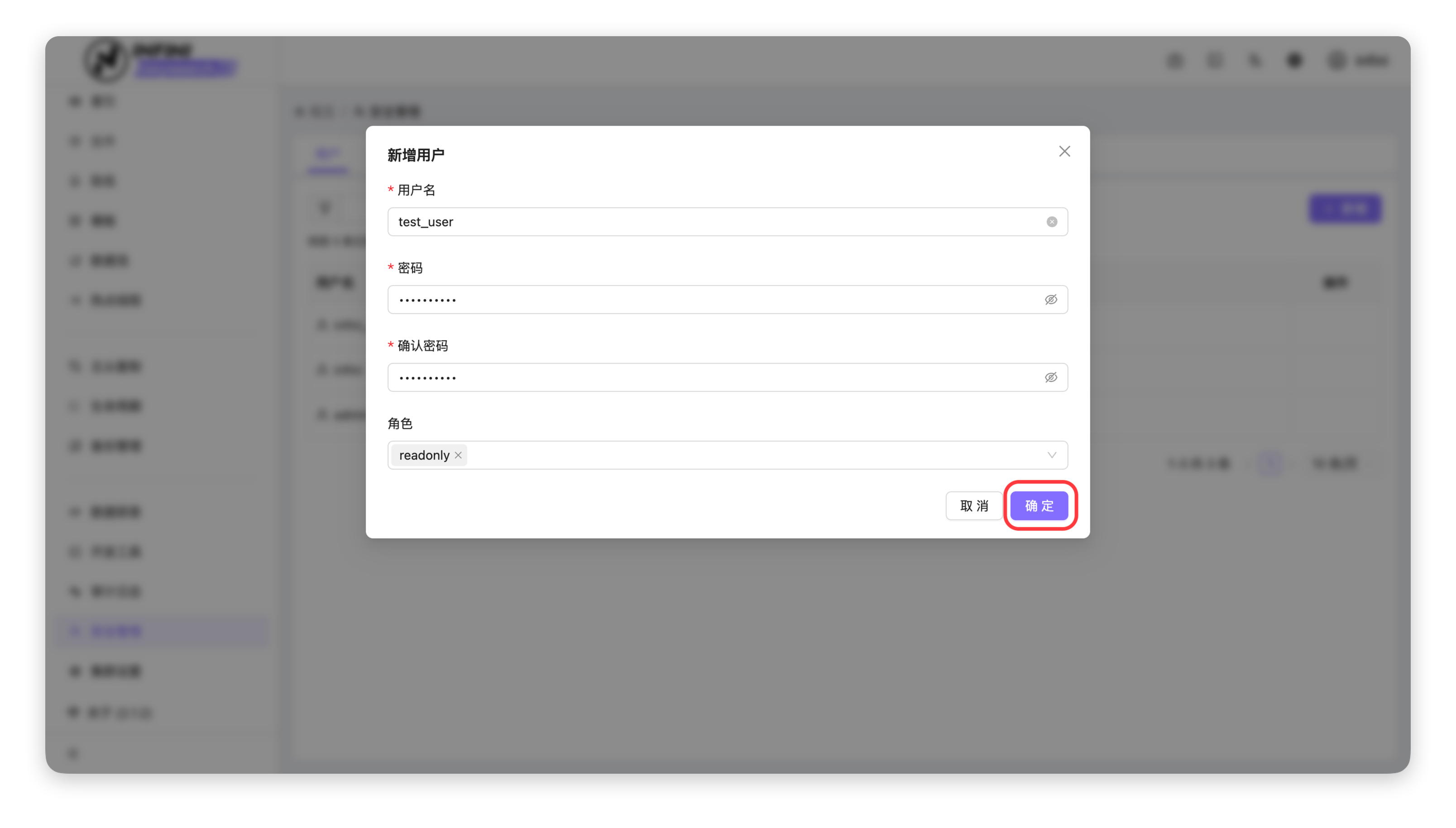 完成创建:信息填写无误后,点击「确定」,系统将创建该用户。
