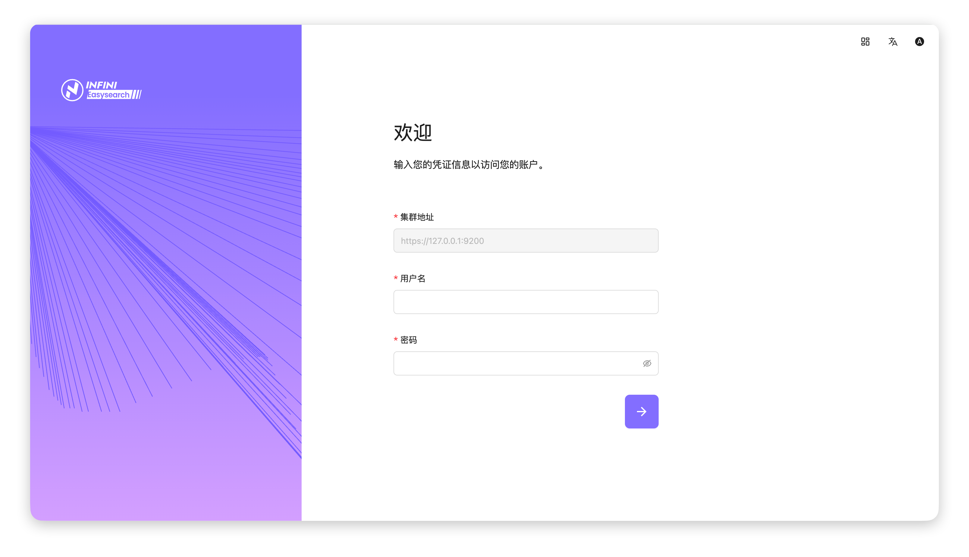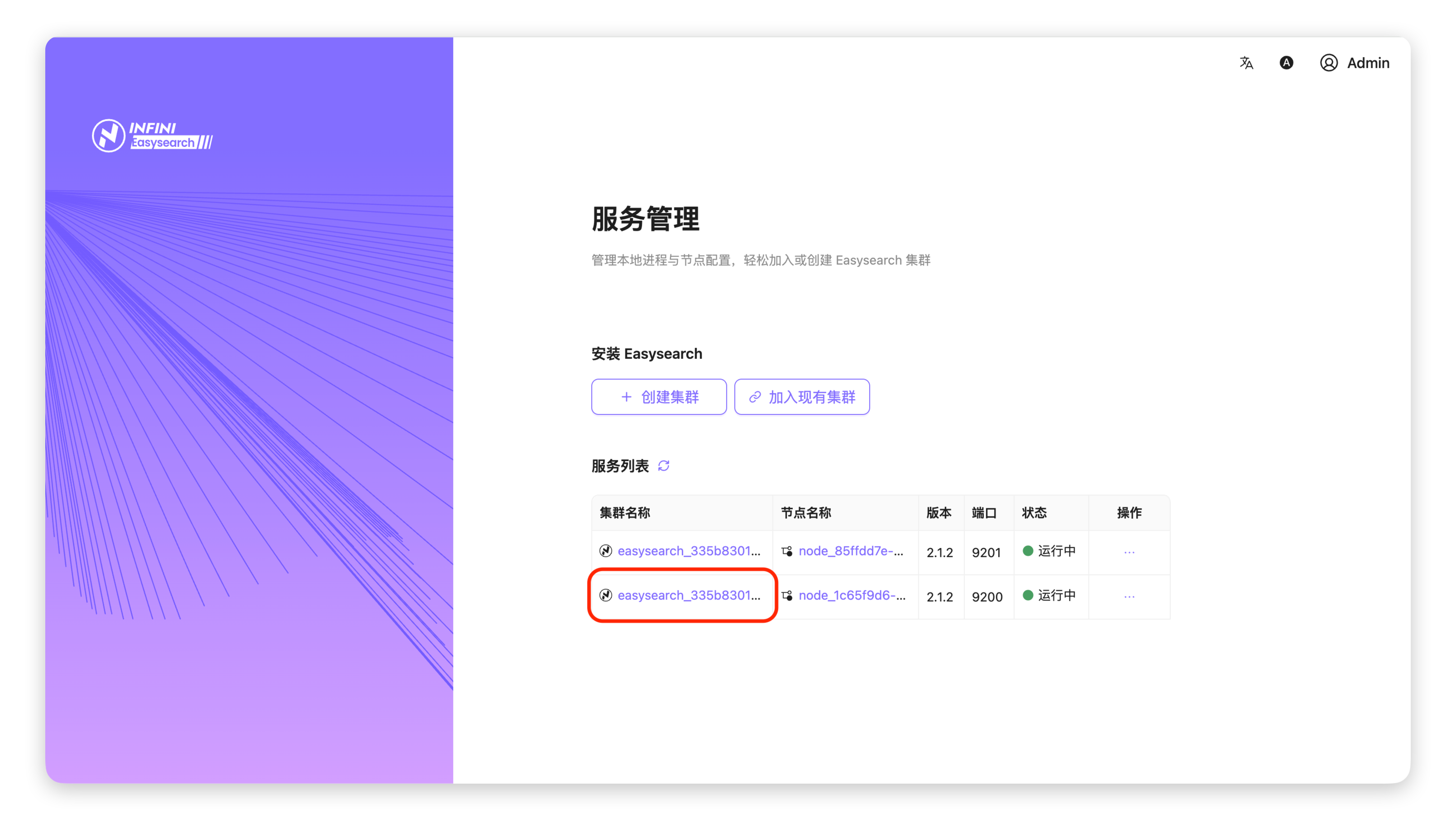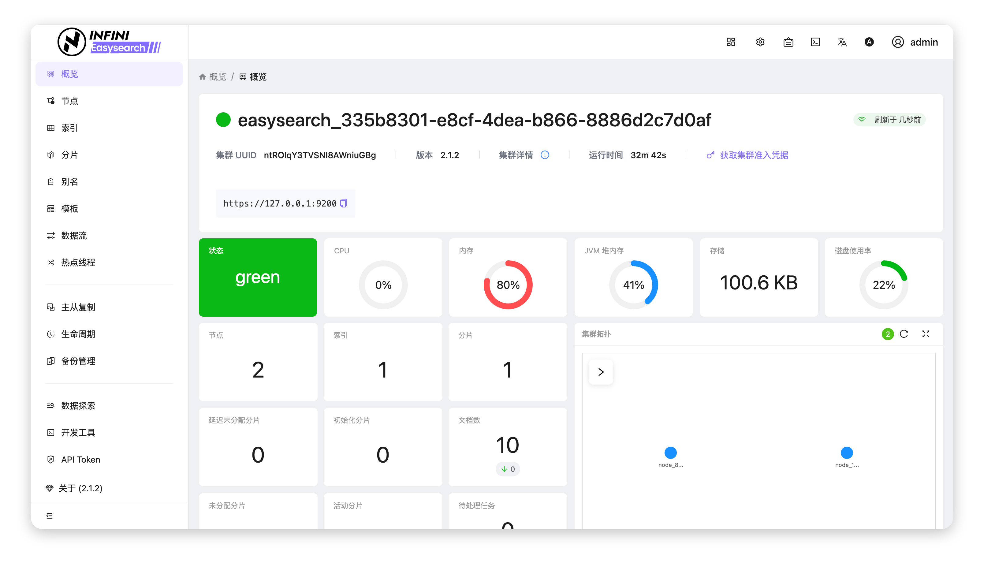 进入 Easysearch UI 概览 #可以从服务管理平台快速跳转到 Easysearch UI 的概览页面。操作步骤 #进入服务管理页面:在 Agent UI 的「服务管理」页面中,找到目标集群,点击集群名称。完成身份验证:在跳转的登录页面中,输入集群地址、用户名和密码,点击箭头按钮进行登录。进入集群概览页面:登录成功后,即可进入 Easysearch UI 的集群概览页面,查看集群状态、节点信息、资源占用等核心指标。