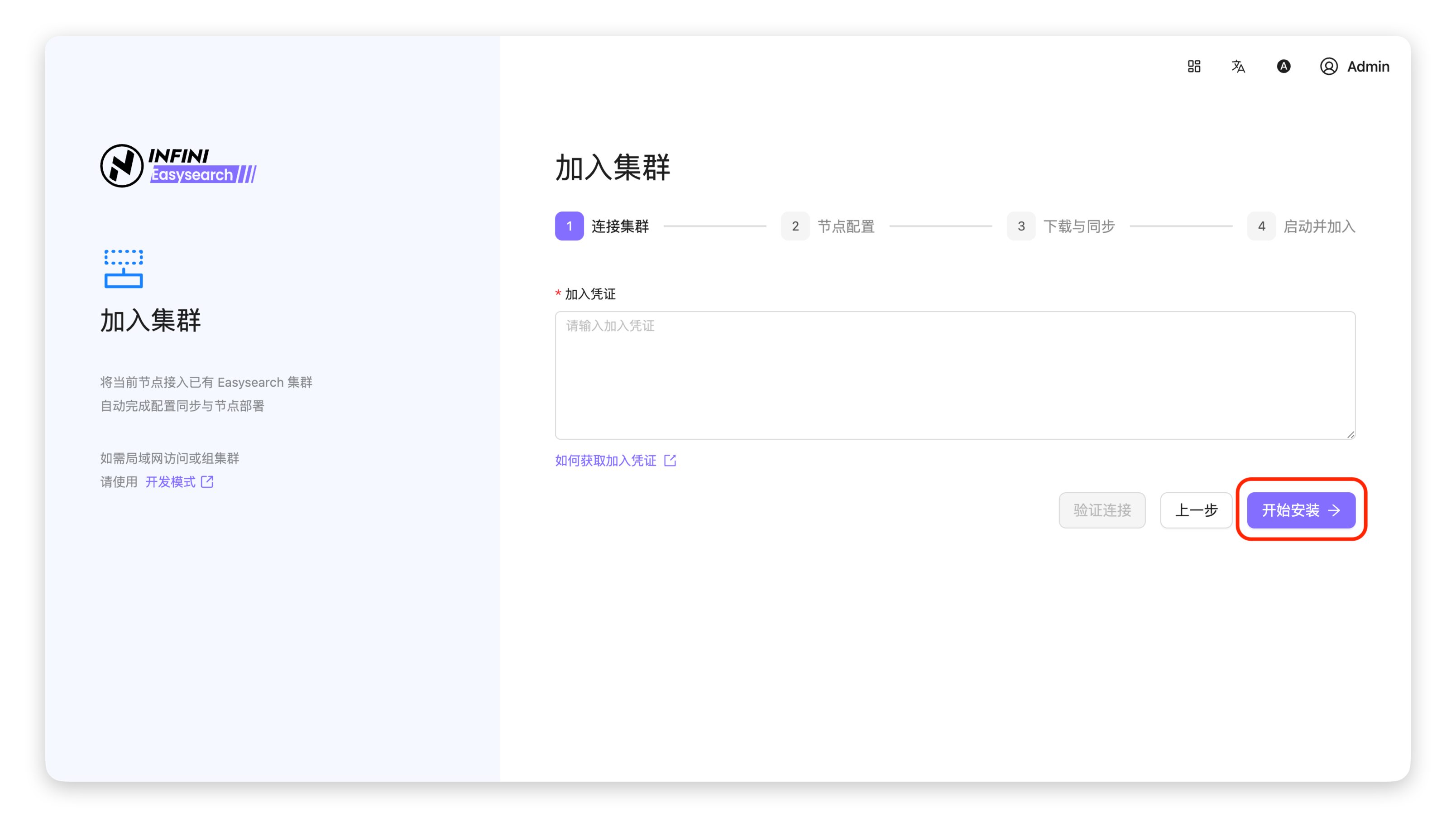 - 完成集群加入:安装完成后,页面将显示节点已成功加入集群,点击「打开 Easysearch」即可访问服务。