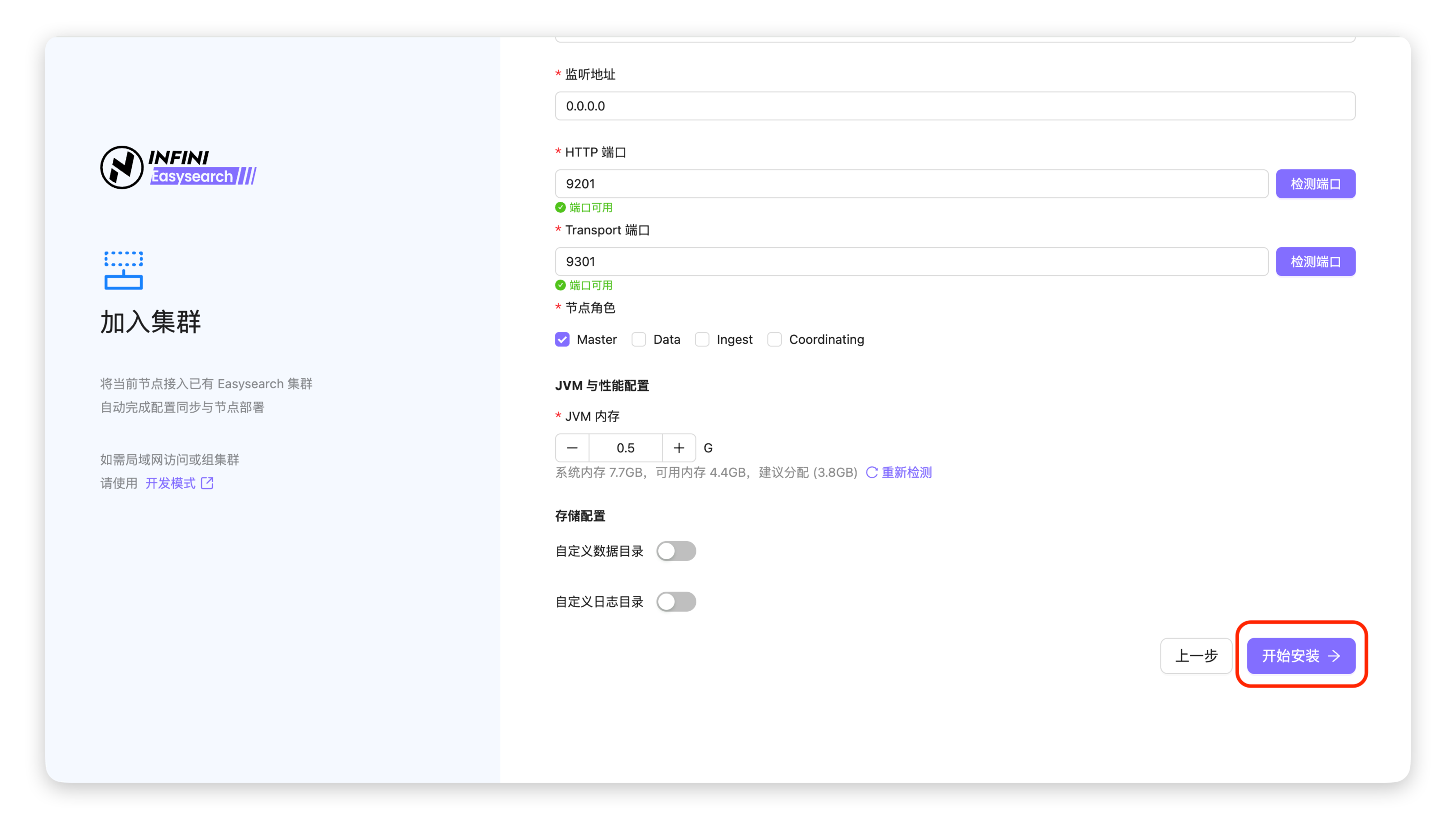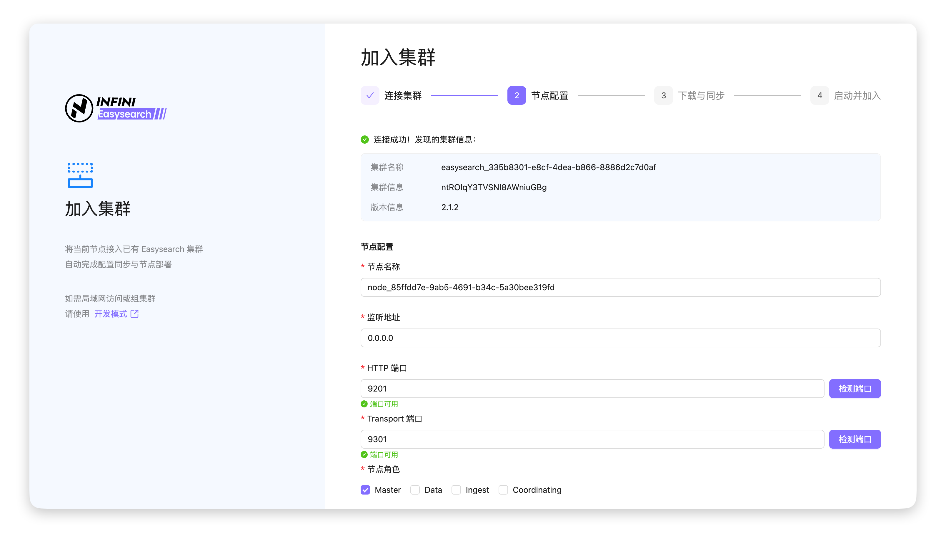 - 节点的 HTTP 端口和 Transport 端口需为空闲端口,可通过「检测端口」功能进行校验。