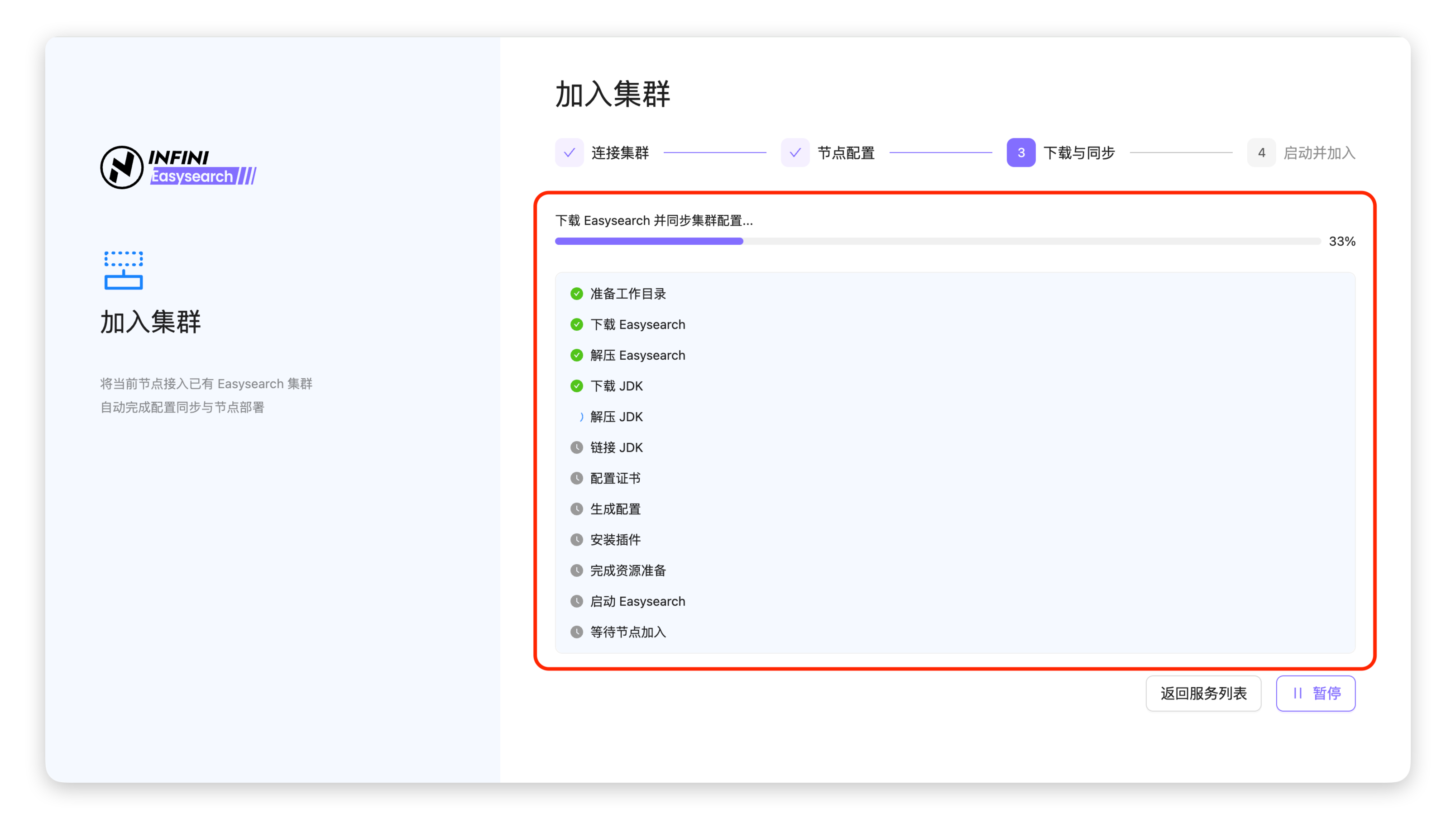 - 等待下载与同步:系统将自动下载 Easysearch、JDK 并同步集群配置,等待进度条完成。