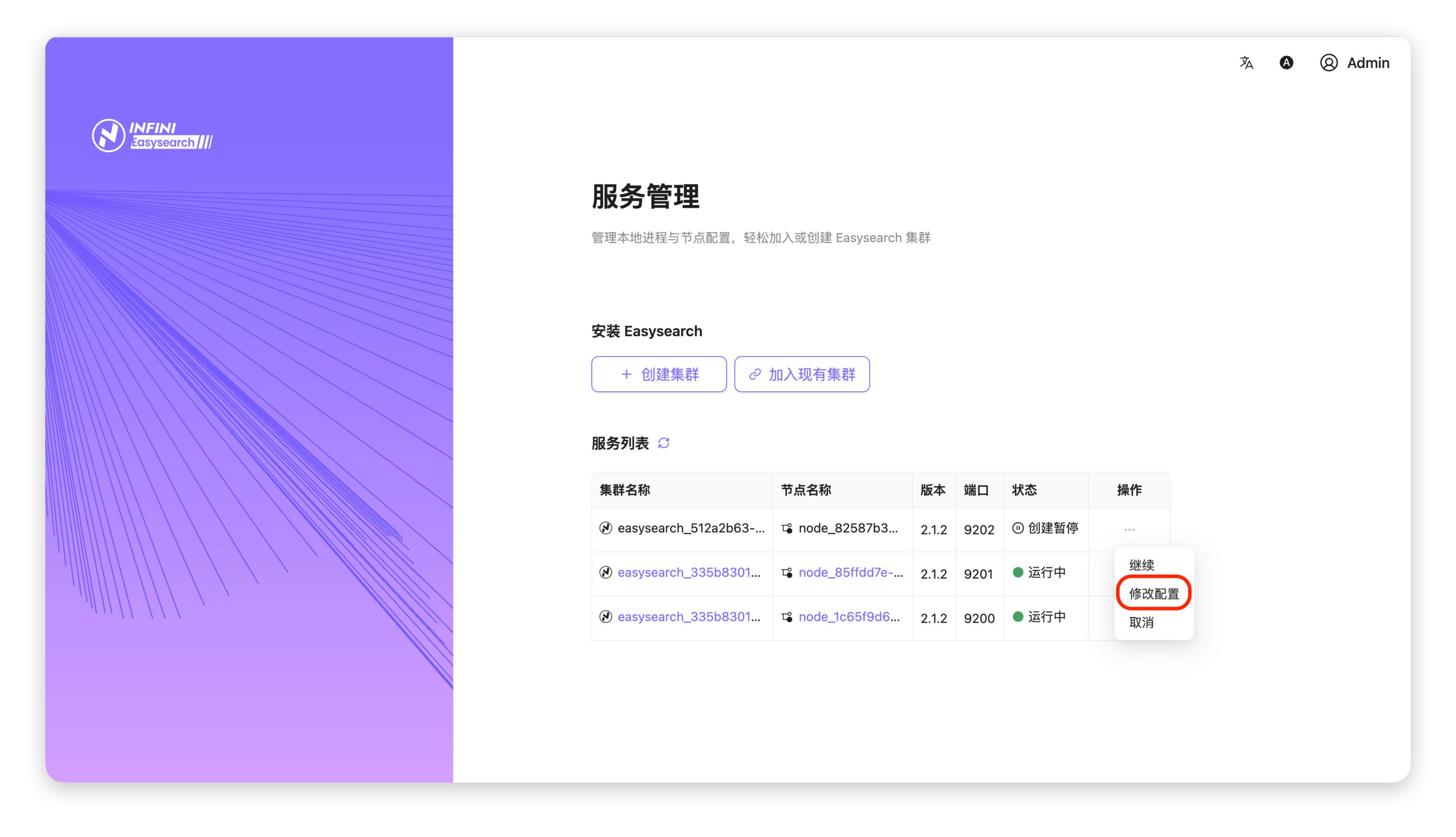 - 调整集群配置:在弹出的创建集群配置页面中,修改 Easysearch 版本、监听地址、端口、管理员密码、JVM 内存等参数。