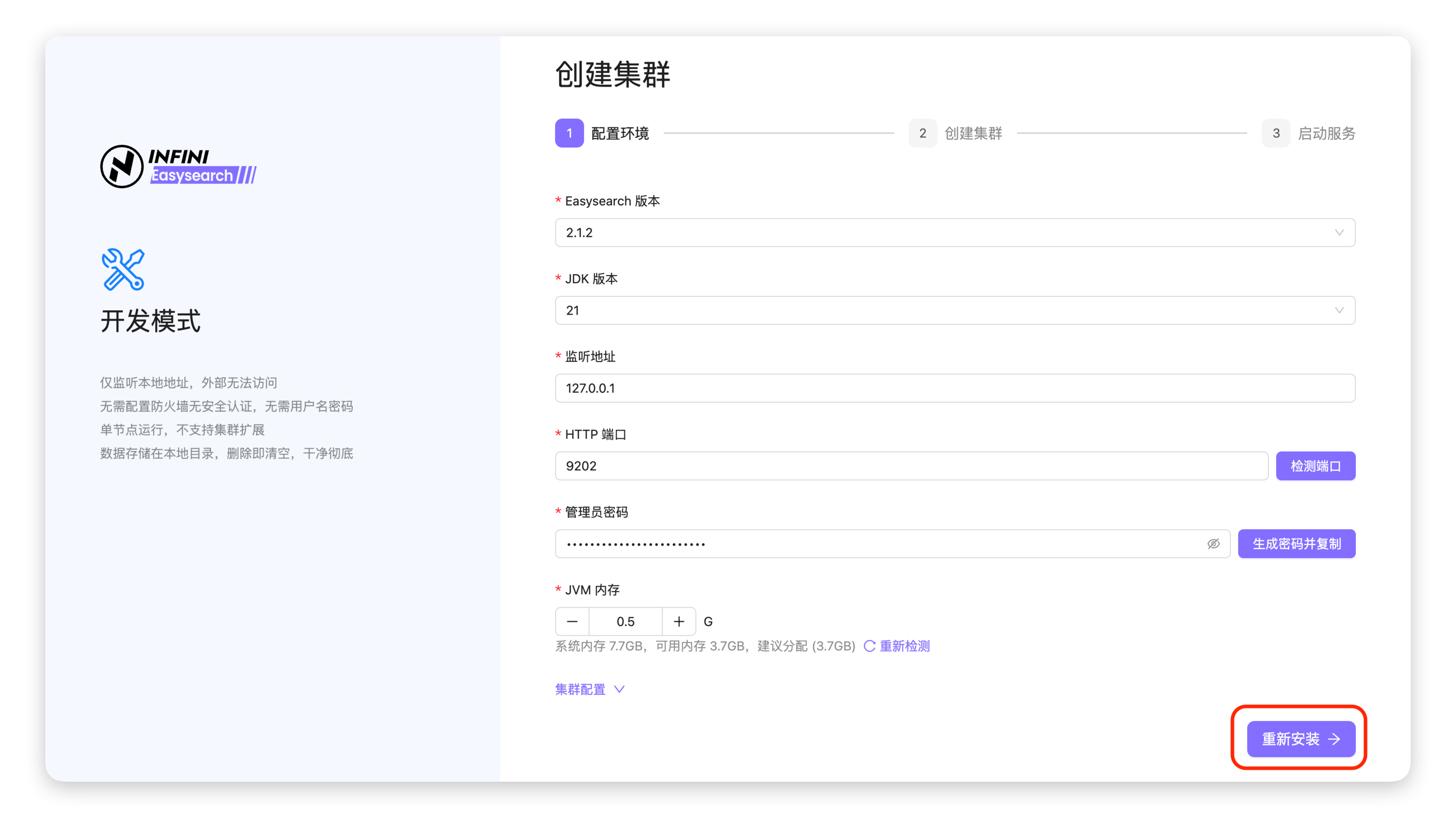 - 重新启动创建:配置修改完成后,点击「重新安装」按钮,系统将根据新的配置继续集群创建流程。