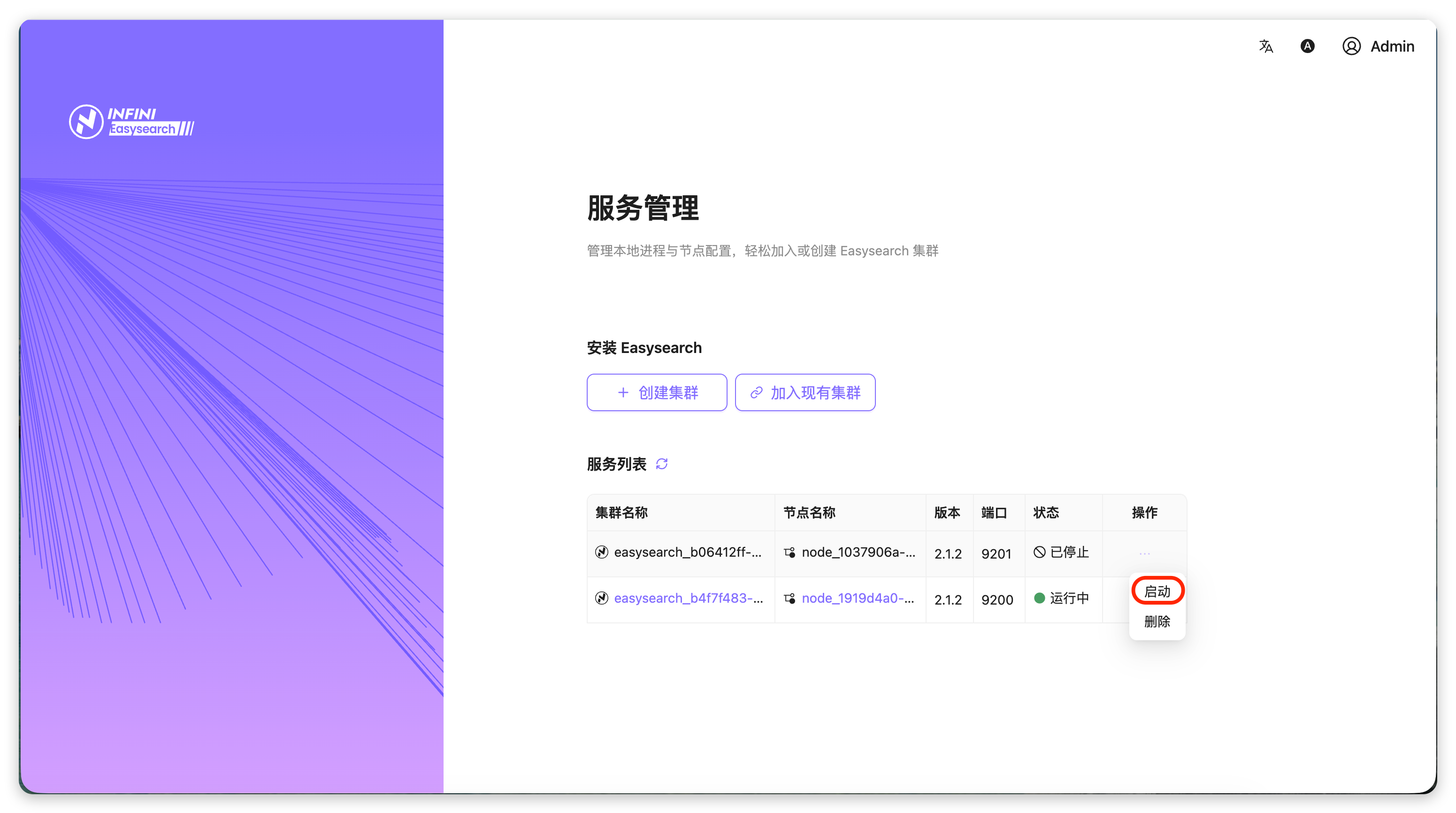 进入服务管理页面:登录 Agent UI 后,在服务管理页面的「服务列表」中,找到状态为「已停止」的目标集群。