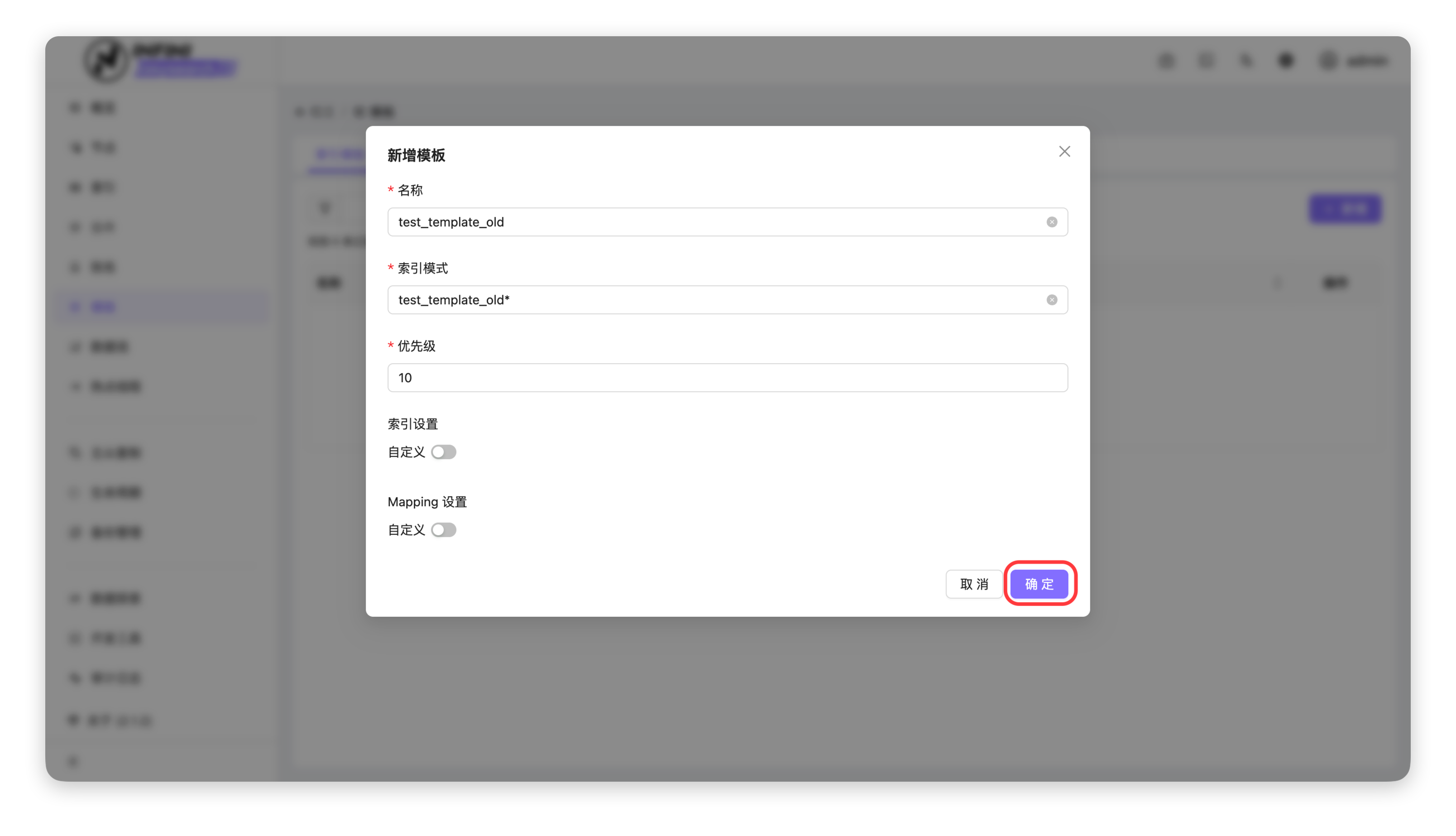 - 完成创建:配置完成后,点击「确定」按钮,系统将自动创建索引模板。