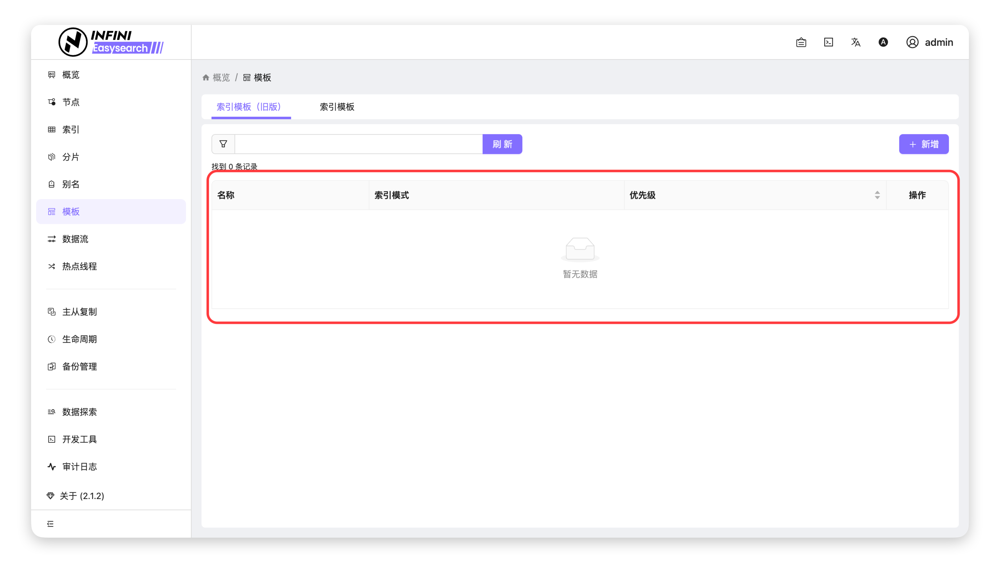 - 进入模板页面:在左侧导航栏点击「模板」,切换至「索引模板(旧版)」标签页。